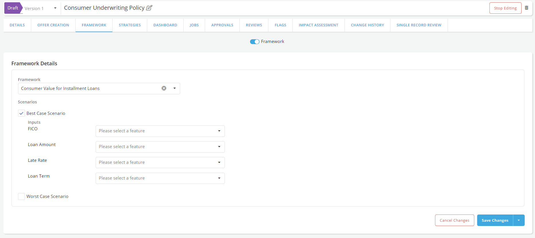 Framework toggle: Specify whether the policy will use a loan valuation framework or not by switching on the Framework toggle.