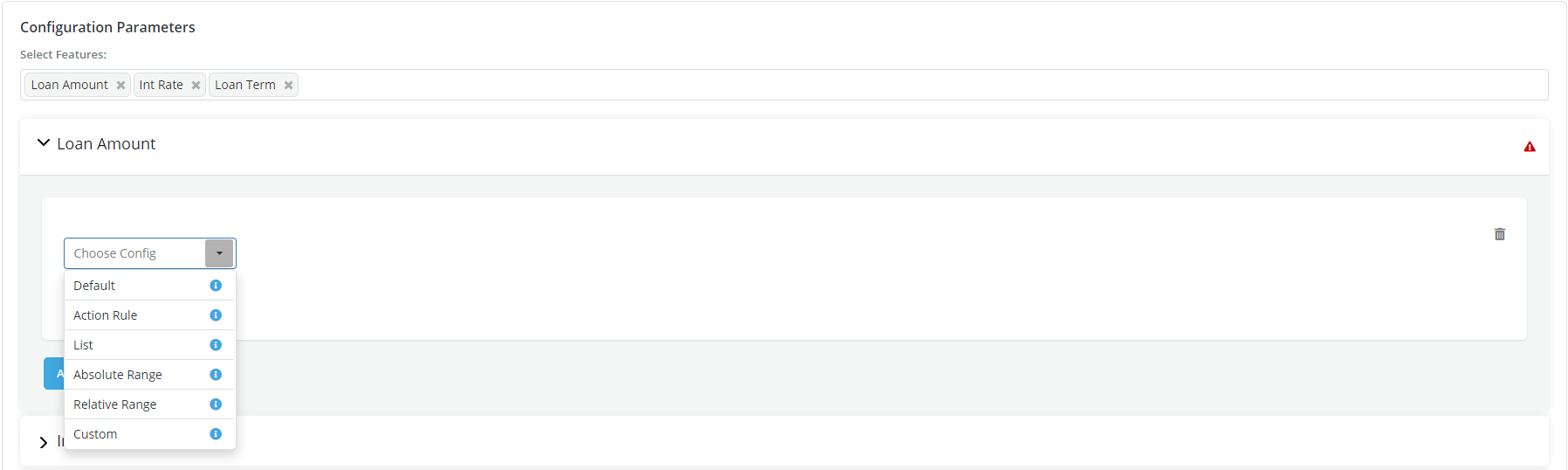 Choose and add following parameters as appropriate: Default, Action Rule, List, Absolute Range, Relative Range, Custom. These parameters have some limitations described below.