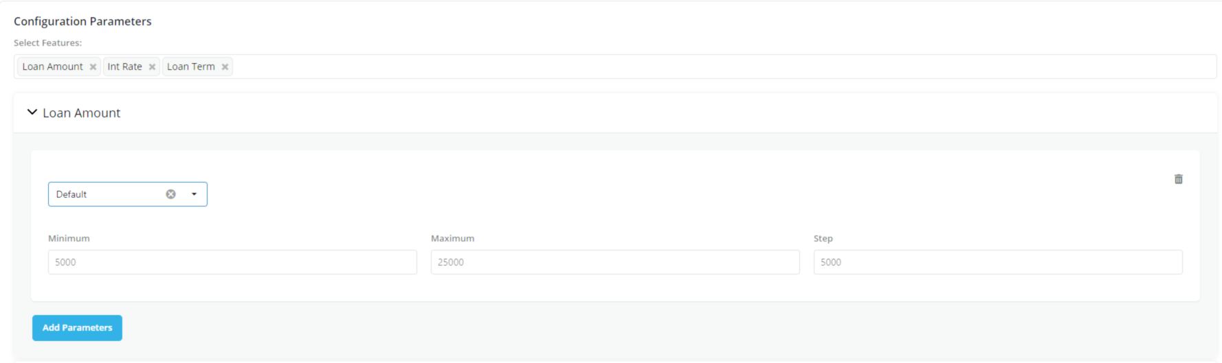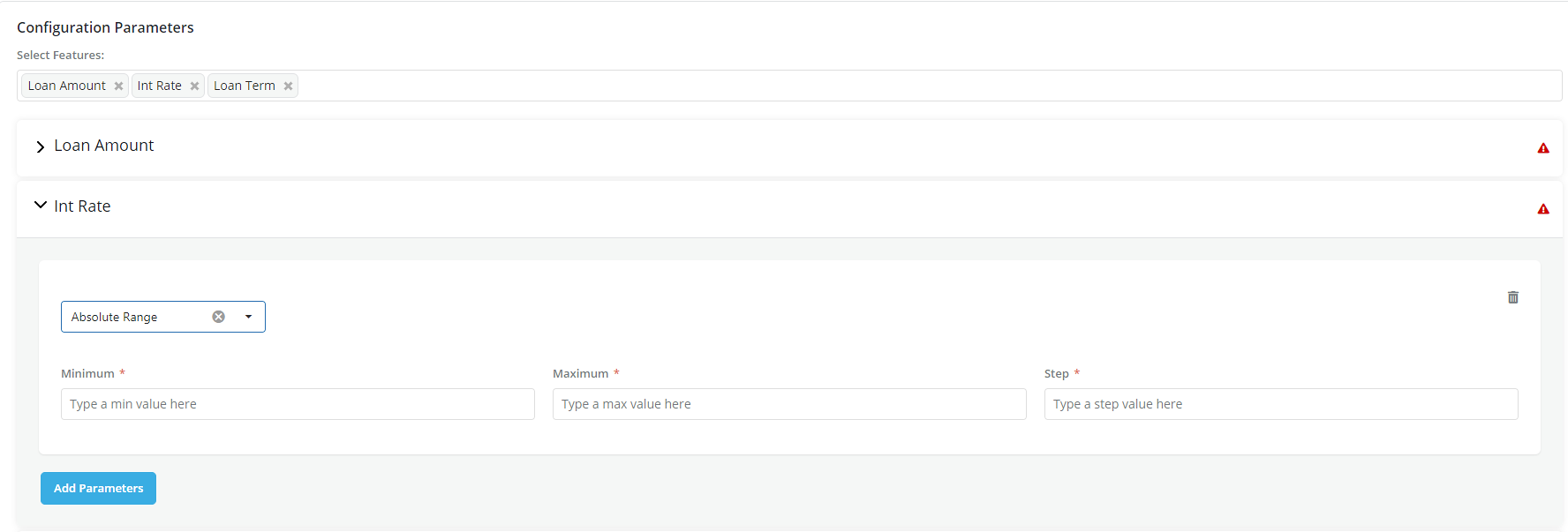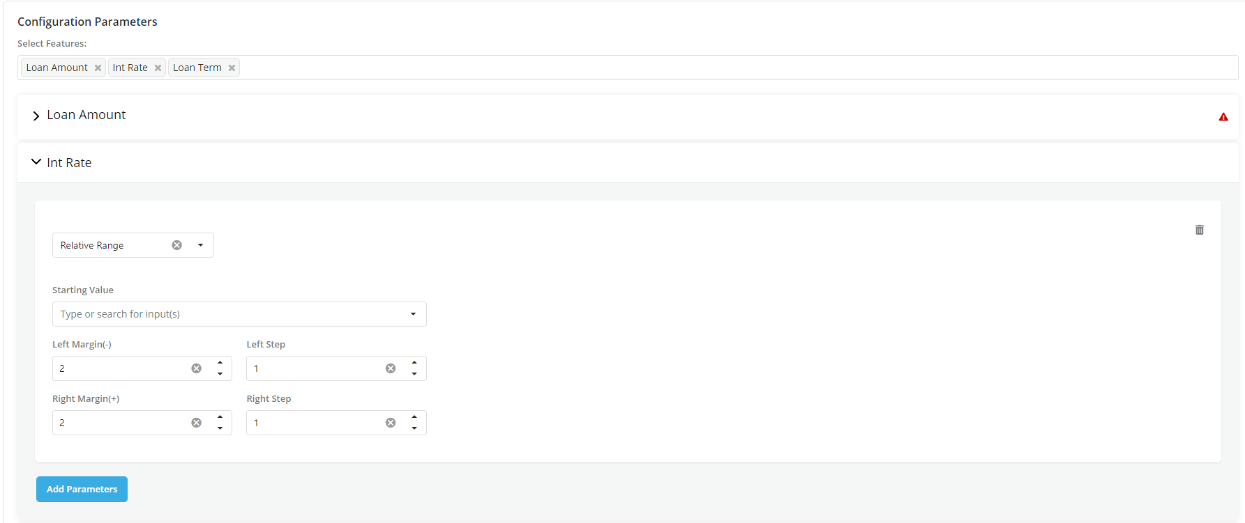 Specify a range of possible values for the product configuration. In this option, a range of value that the parameter can take is defined as: * Minimum- Define the minimum value for the parameter * Maximum: Define the maximum value for the parameter * Steps: Define how to move between the maximum and minimum range in steps.