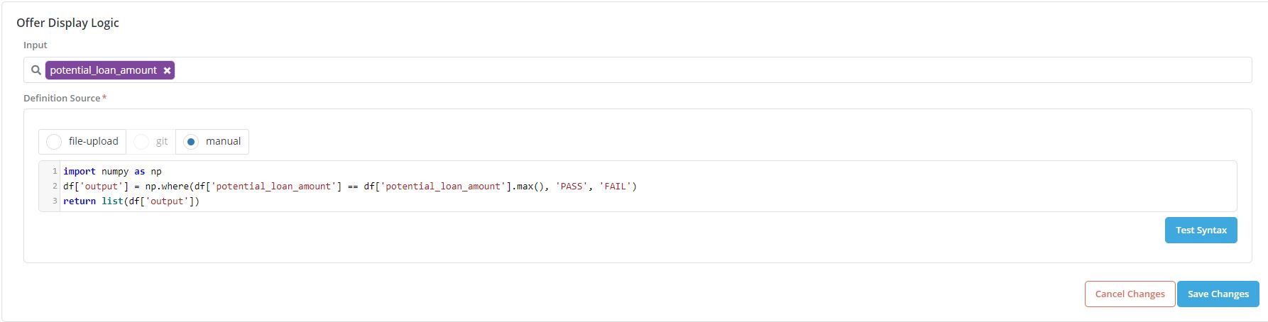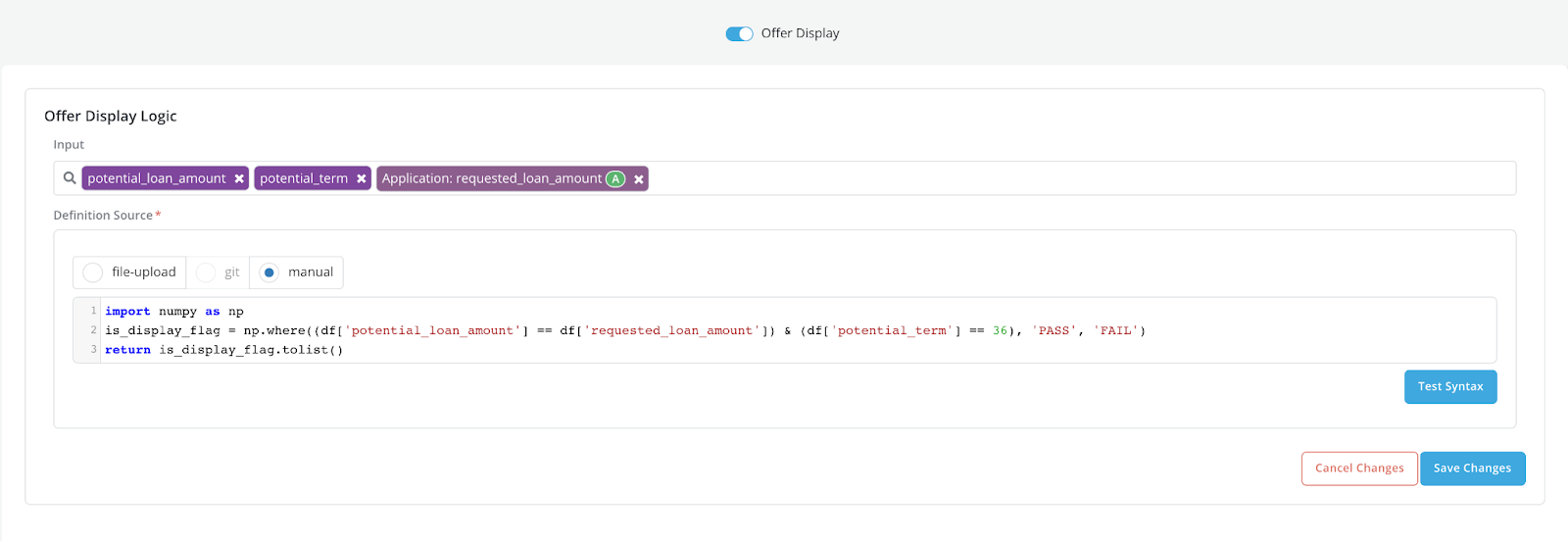 The logic in Offer Display takes in the df(the set of valid offers), and flags all the offers with below 2 conditions as ‘PASS’: * potential_loan_amount = requested_loan_amount * potential_term = 36