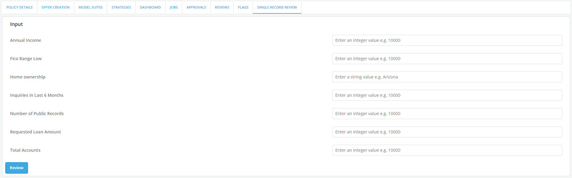 - Add values to the form that appears. This Input form is a form tailored to the policy being reviewed that gets generated for the user to assign values to the policy inputs
