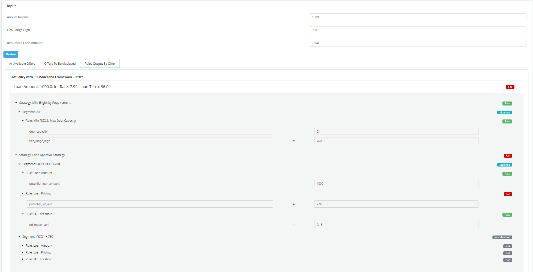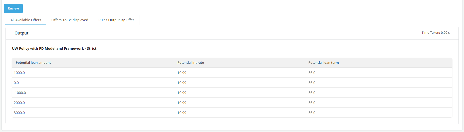 Review Result - Rules output by offer: This displays all possible offer as the outcome for each single rule in the policy and return information based on the strategies/ segments/rules configured.