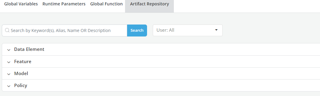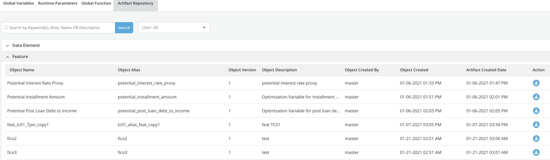 This is a repository of all the artifacts that have been created for all the approved objects (Data Element, Feature, Model, Policy) in the Platform. An Artifact is a bundle of documents, including an executable script, that gets generated once an object is approved. Artifacts can be downloaded and executed outside of the platform.