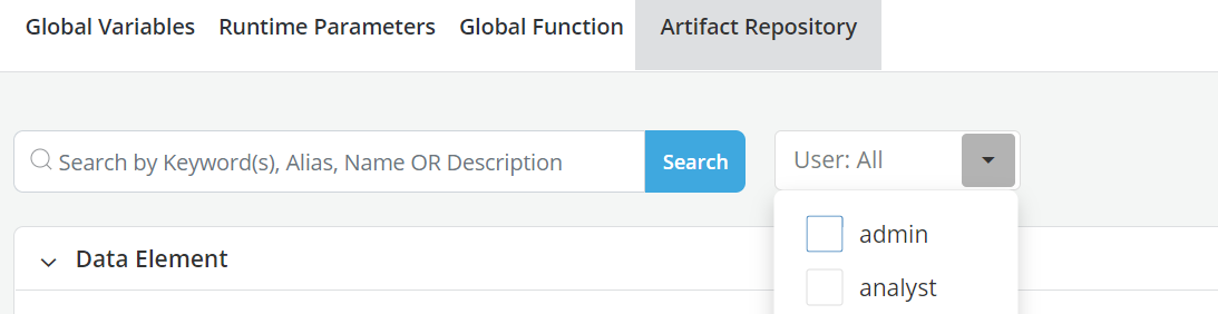 The artifact repository is organized by object types and has a search and filter capability. For instance, users can click on User drop down to select the objects created by specified users. Users can access the details of the object used to generate a given artifact by clicking on it and then clicking on the "Access Full Details" hyperlink displayed in the popup window.