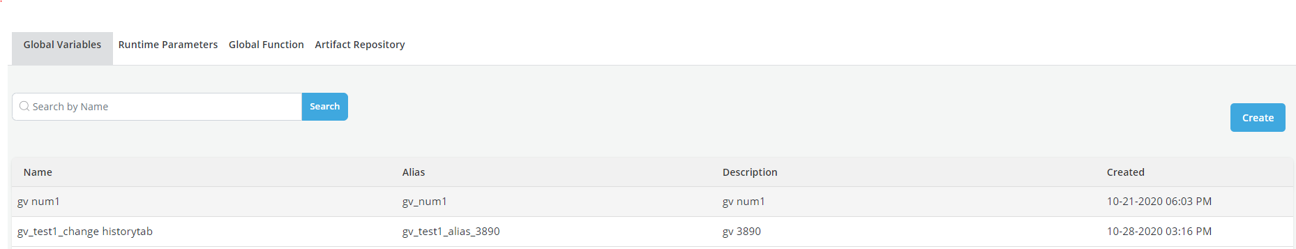 - Global Functions window is opened by default, click on Global Variables. Then click Create.