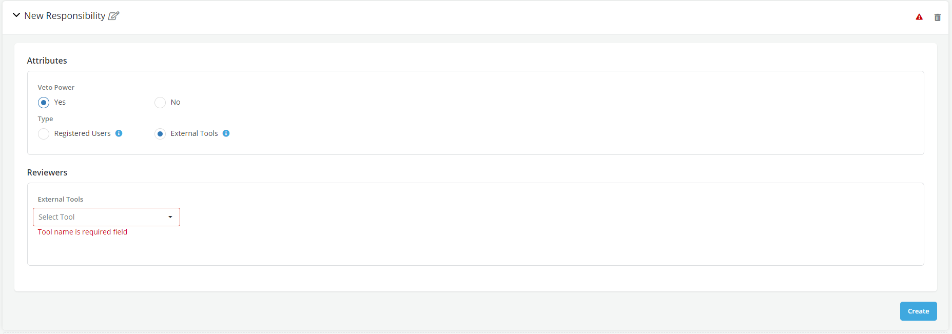 External tools: This option is visible if any third-party tools are configured on the platform and allow users to define a 3rd party application as a responsibility within an approval workflow. Select the appropriate tool.