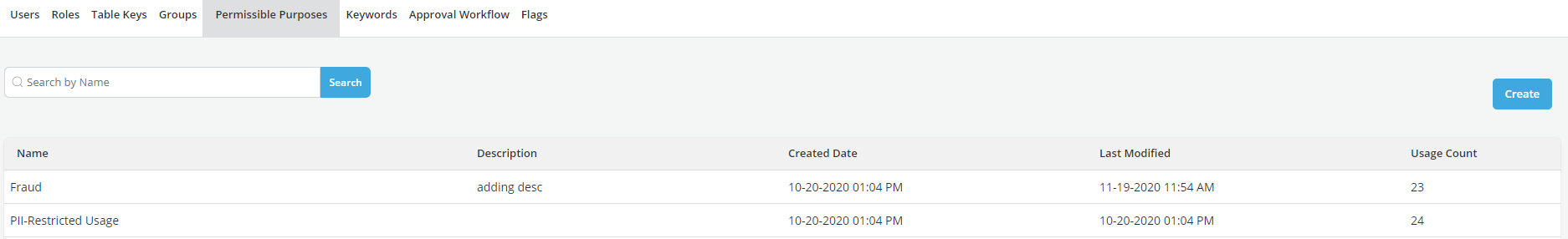 - Click on Permissible Purposes and click on Create. This option is used to define how an object is to be used in the platform