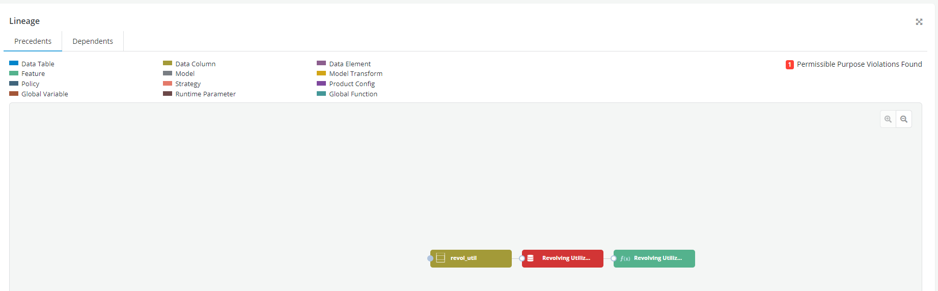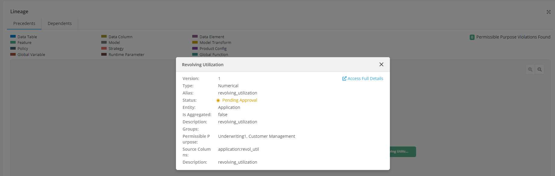 - Notice that system now shows a Permissible Purpose violation error since the Feature and the comprising data element have different Permissible Purpose