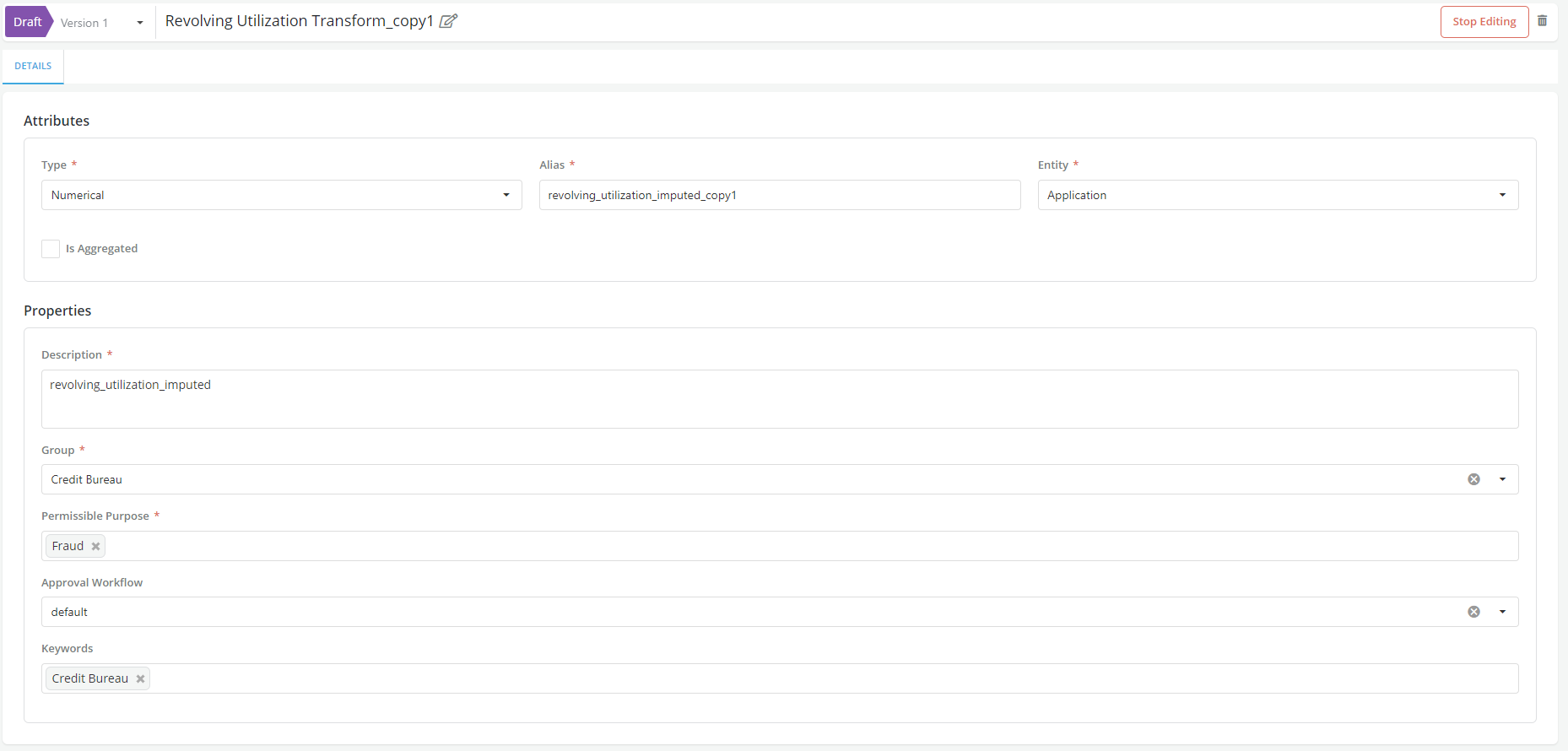 - If the Permissible Purpose of the Feature "Revolving Utilization Trasnform" is changed to Fraud and save changes