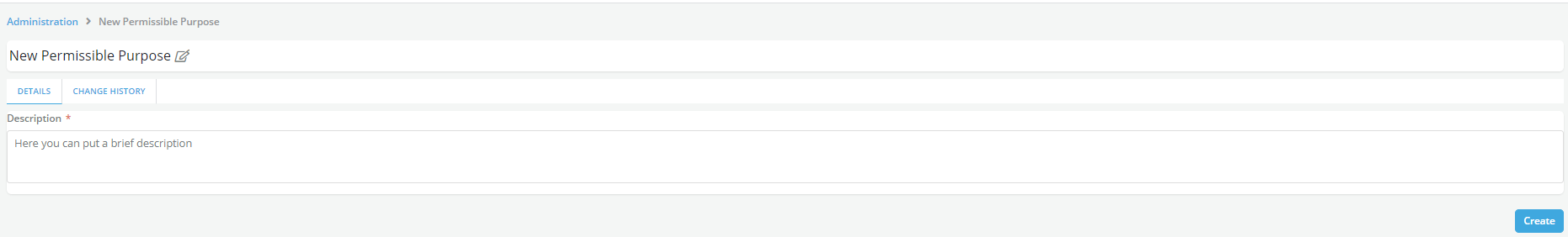 - Complete creation and modification history, i.e. the audit trail, of the Permissible Purpose can be viewed in Change History Tab