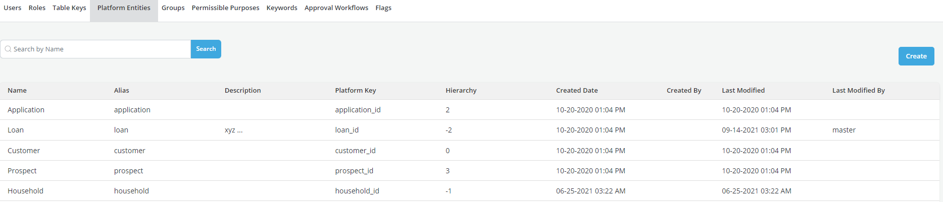 An entity is an object to which a set of information is attached and on which a business decision can be made. For instance, an application is an entity to which a credit bureau file is attached and on which a decision to approve or decline is made. Examples of entities are: Prospects, Applications, Accounts or Customer. This capability allows Users to configure and register new platform entities. They can add multiple entities or delete unused platform entities.