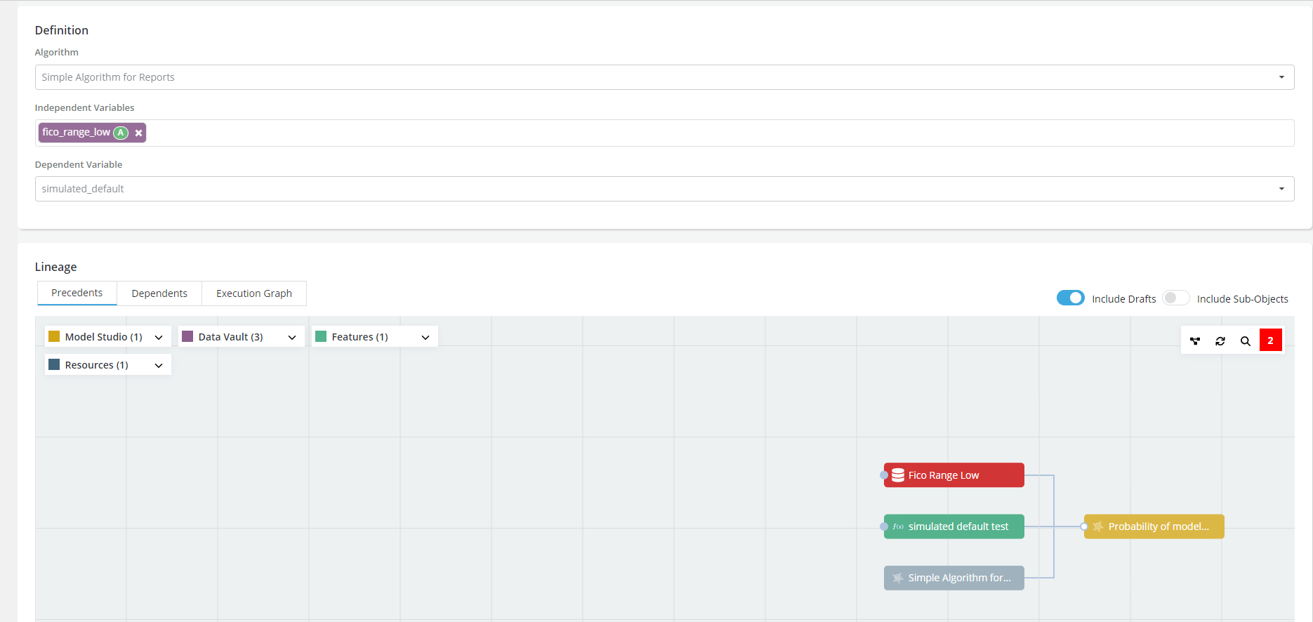 Case study: User has registered Fico Range Low and Loan Amount as data elements, created Default Within 18 Months as a feature and registered Default Model Algorithm for training default models. Now User wants to create a modeling dataset for the Default Model Algorithm, the modeling dataset will predict Default Within 18 Months using Fico Range Low and Loan Amount as predictors.