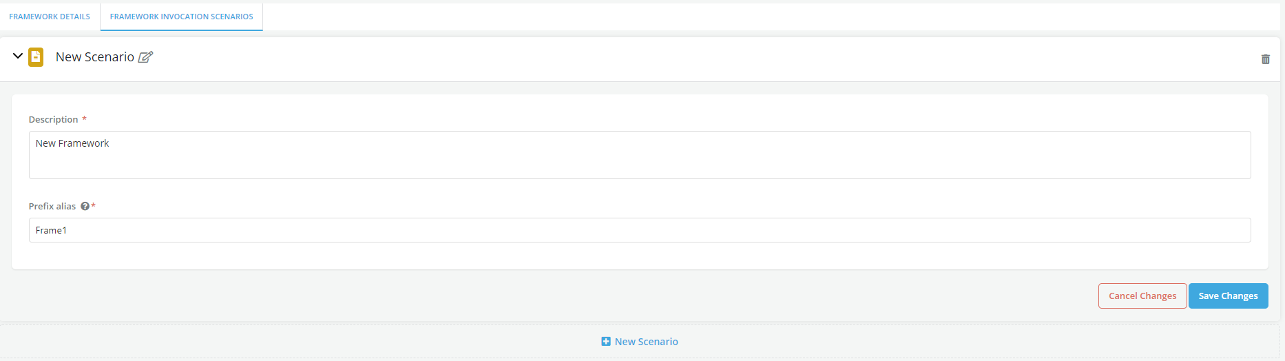 Click on the +New Scenario tab to add a new scenario. One invocation scenario is required for the framework to be approved. Multiple scenarios can be added by clicking on the +New Scenario link