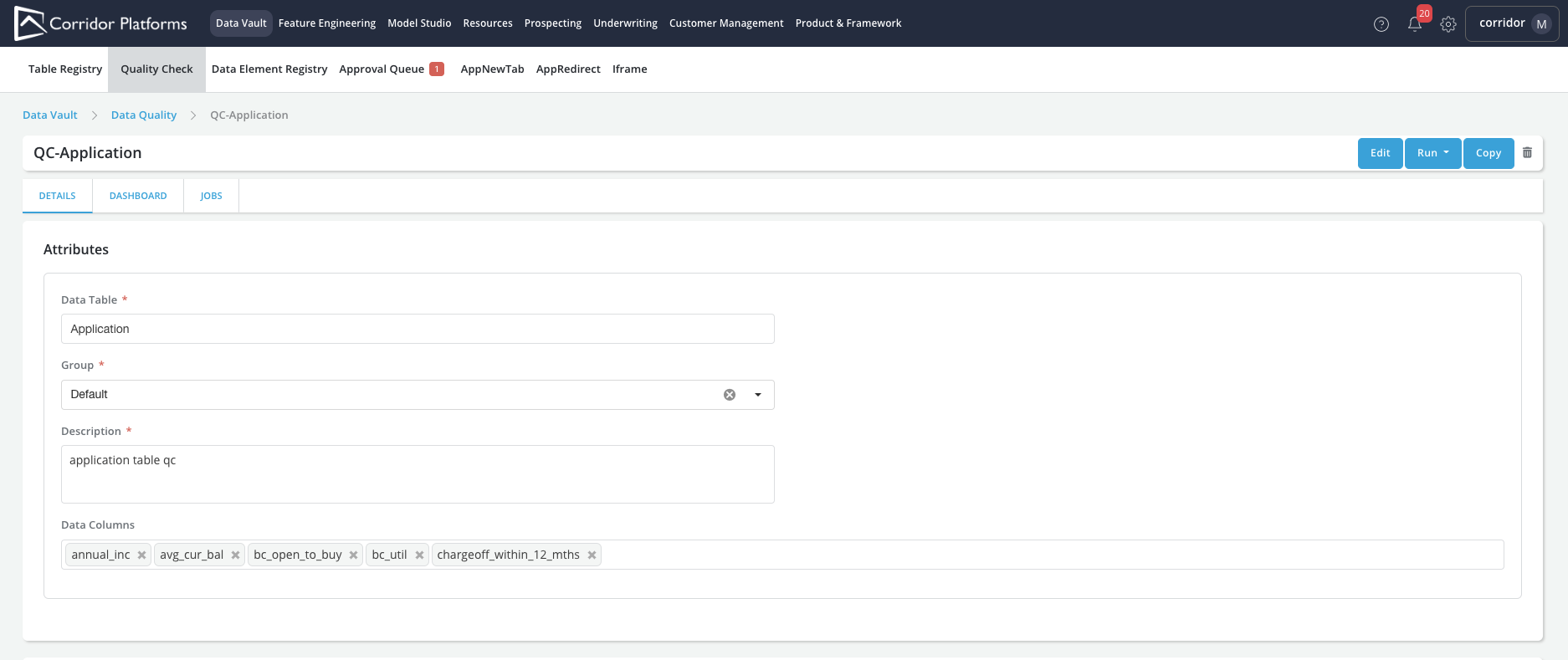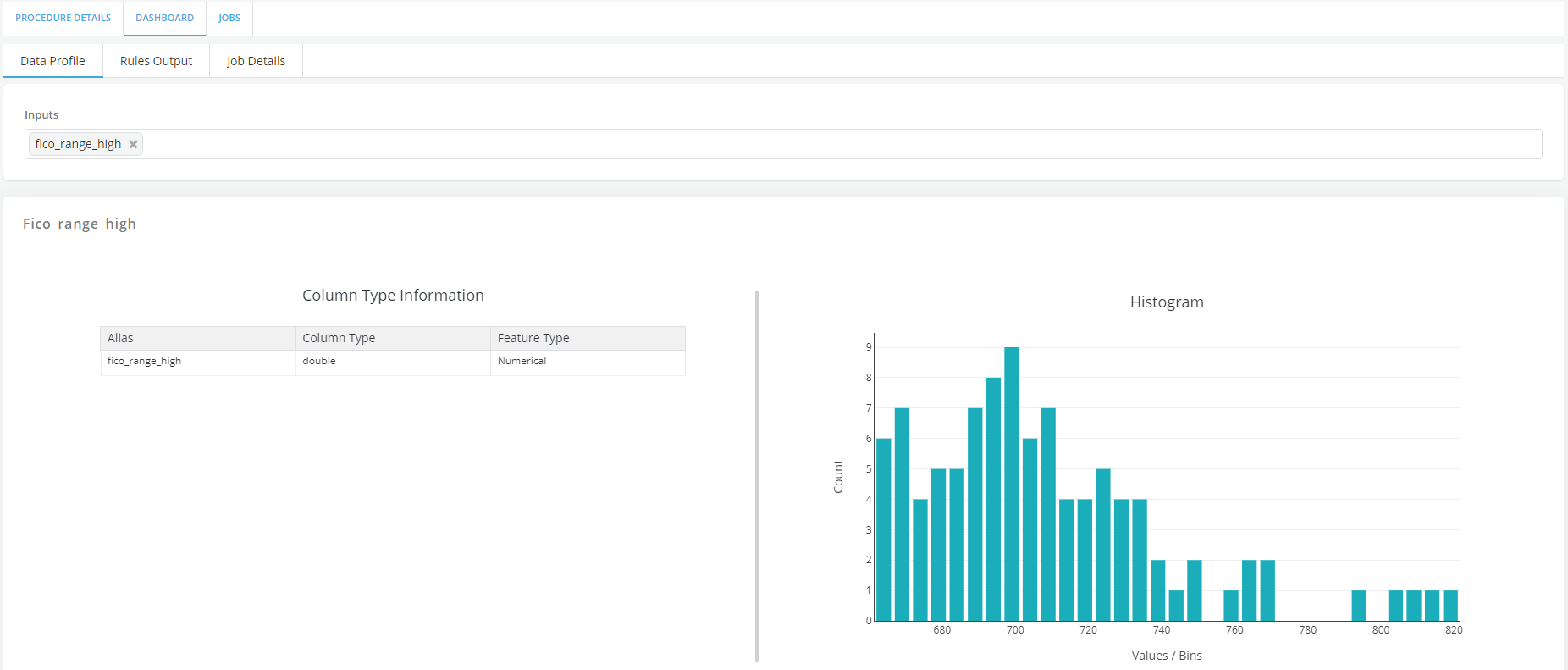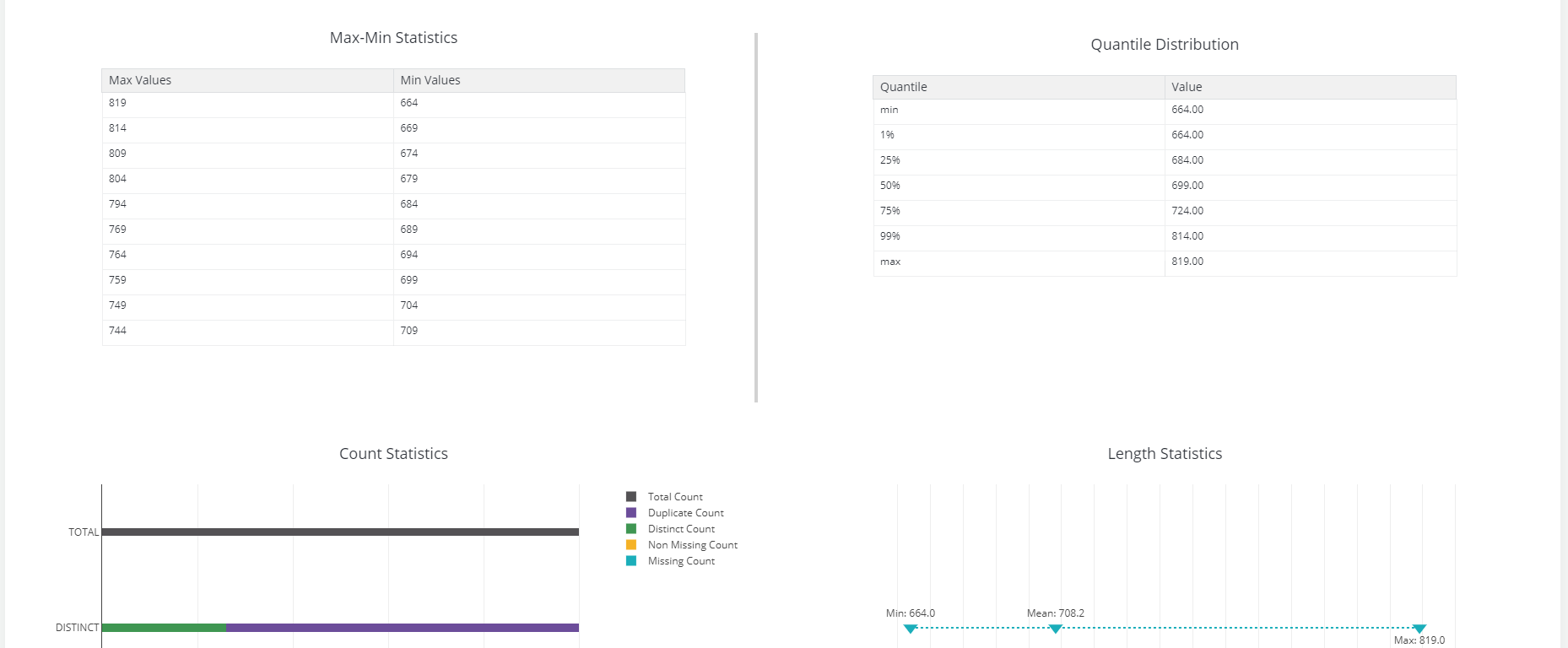 The quality checks procedures generate profiling metrics such as Descriptive Statistics, Outliers Count, Missing Values, Invalid Entries, Frequent Values, along with the results of custom quality check rules.