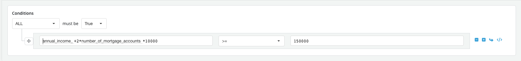 Users can combine multiple objects into expressions that can be used as inputs to a rule (e.g., personal_income - 2*loan_amount >50000)