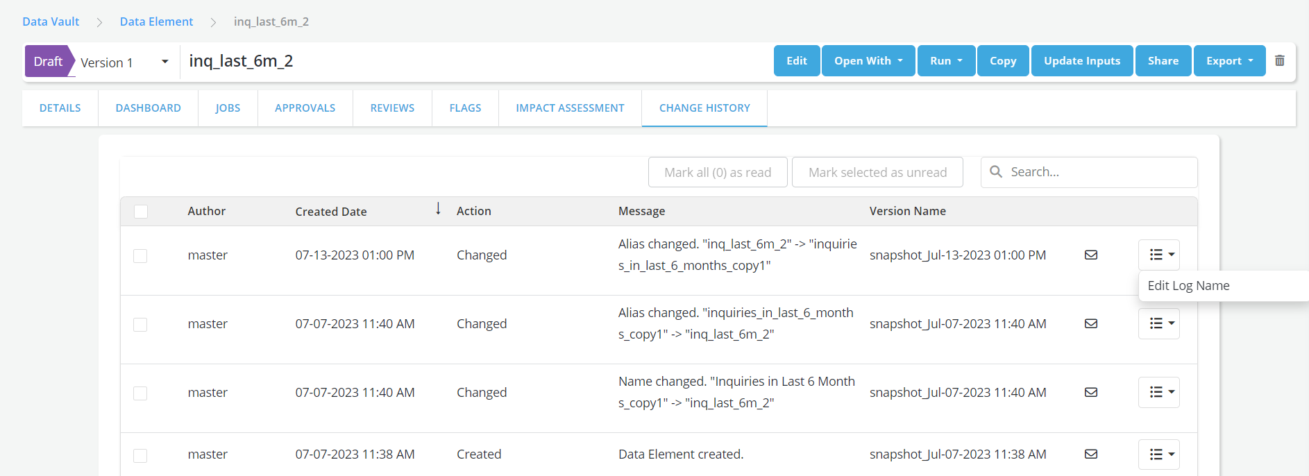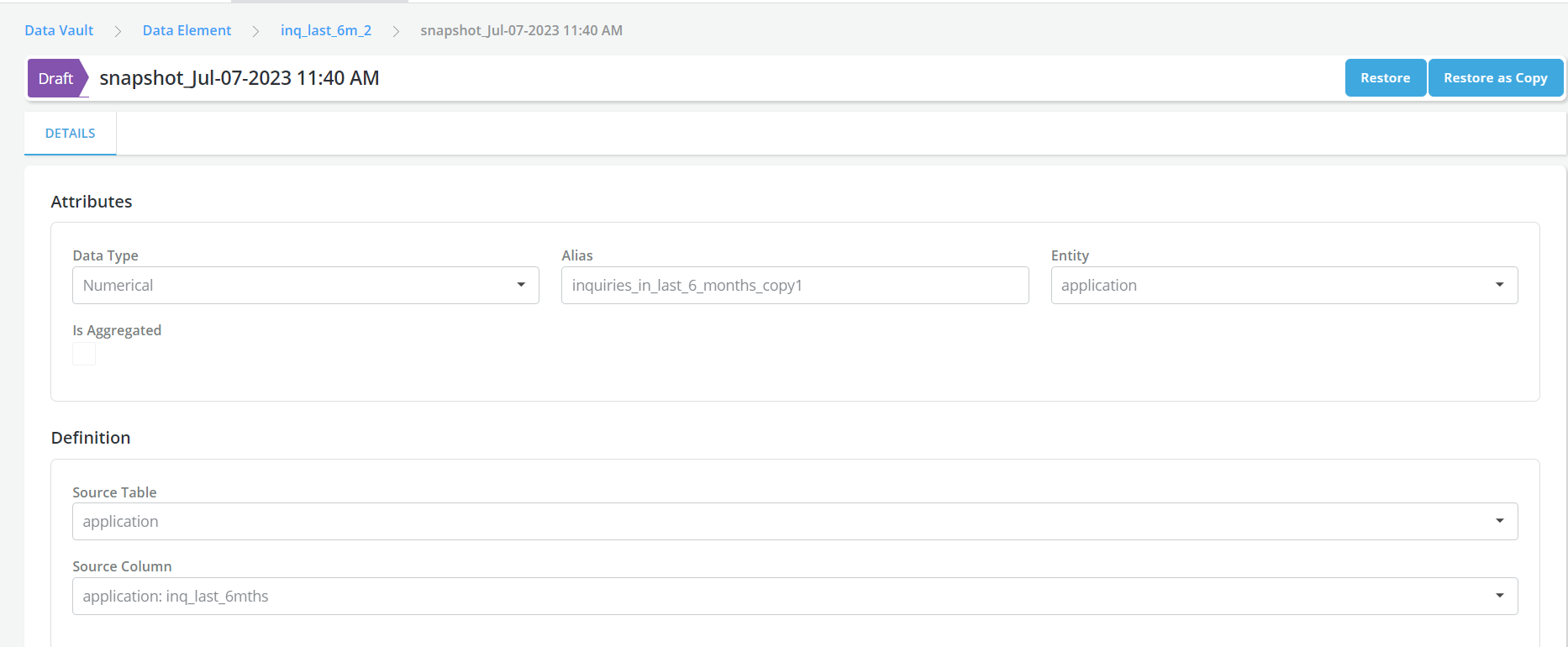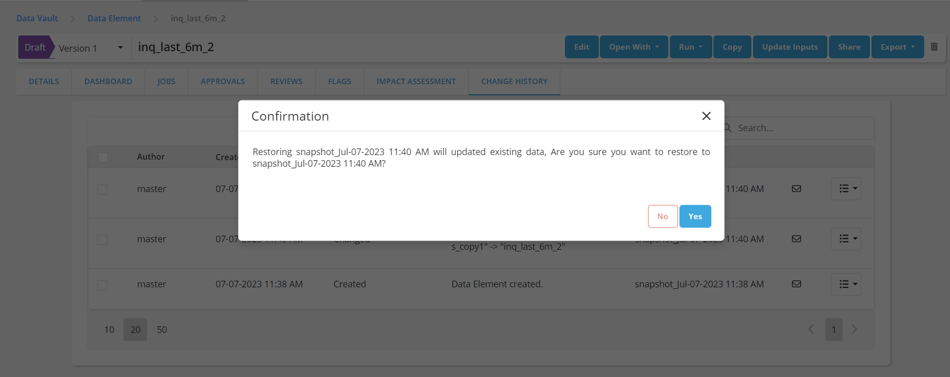 Notes : * Users can revert to an older snapshot of an object if the object has not yet been approved. * Post approval an object cannot be reverted to an older snapshot * Restoring an old snapshot and saving it creates an event in the change log * Objects are editable post restoring