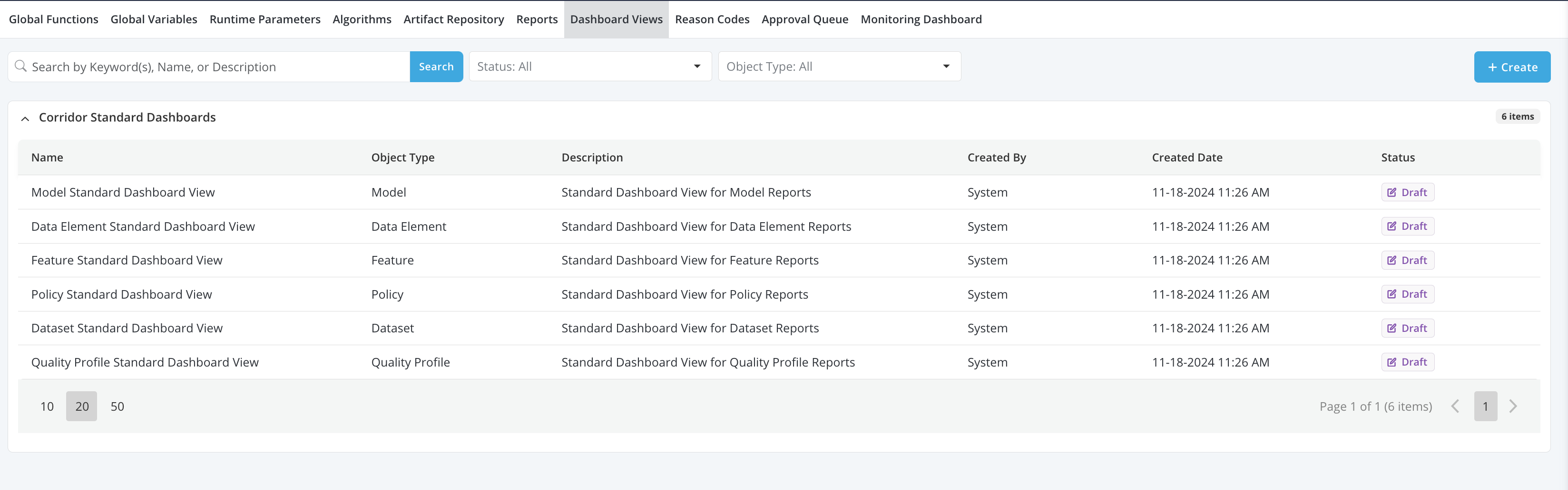 - All pre-registered dashboards, along with the associated reports and global functions are registered under Resources as Draft objects and are accessible by users with Admin permissions.