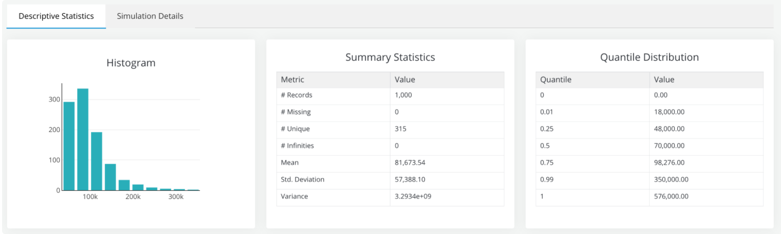 For data elements, features and models, the results of a job run will include a Descriptive Statistics and tab. The Descriptive Statistics tab displays histograms and basic statistics (mean, standard deviation, minimum, maximum, count, missing, percentiles, etc.) for the object.