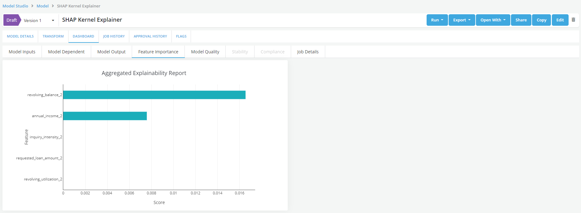 The Feature Importance chart can be used to understand how much each input variable is contributing to the model’s prediction. If an Explainermodel was registered, the simulation results will also include a Feature Importance Tab. This tab displays the key input to the models rank-ordered by their aggregate contribution to the prediction of the model.