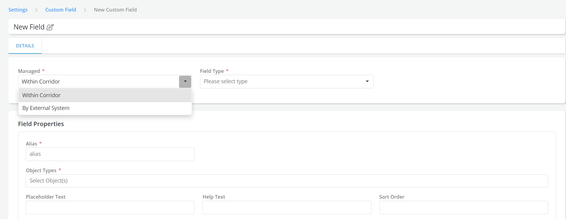 Select Managed field as Within corridor if the value of the field has to be provided by a user on Corridor while creating/editing the object. Or select By External system if the value of the field should be fetched from an external system (For more details on the technical integration with the External System - please refer to the Technology Manual)
