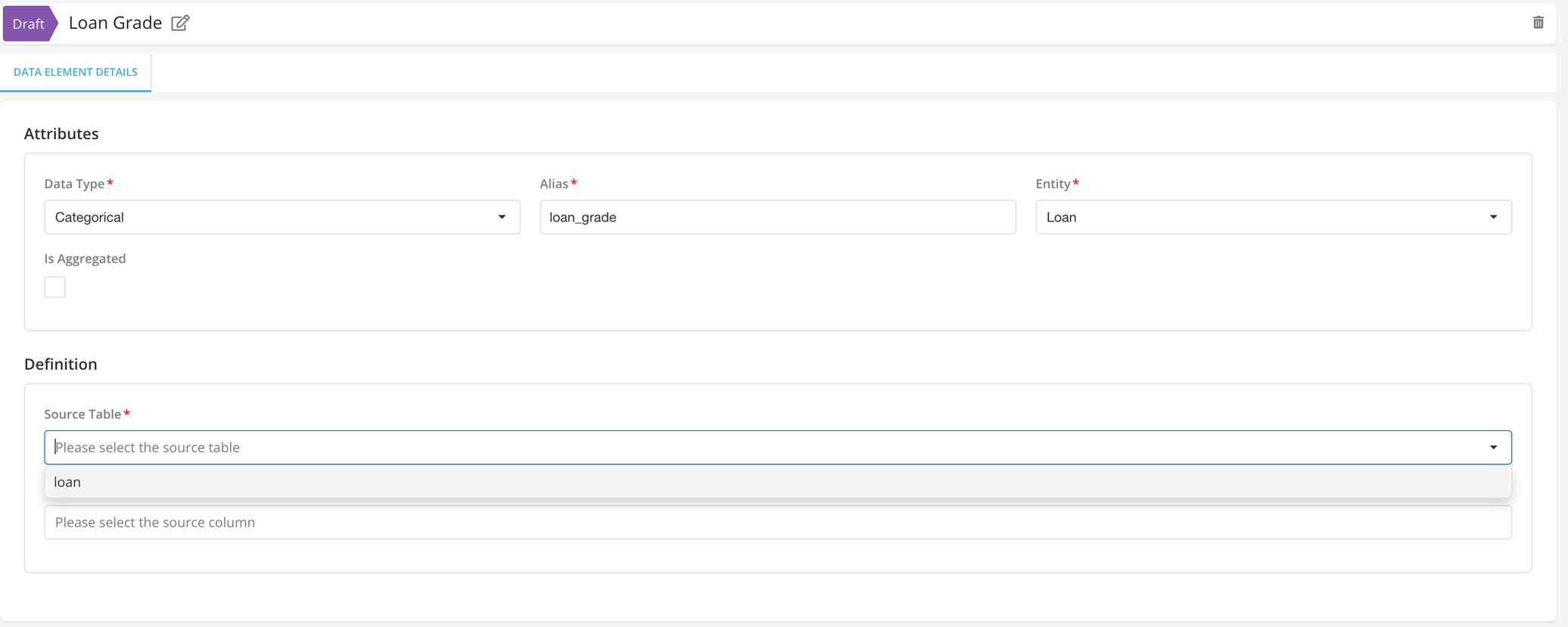 For data elements, source Table designates the table where the data element will be read from. In case of a simple data element, the User needs to specify only one source table; however, for aggregated data elements there may be more than one source table to be specified. The system will show the tables that are linked to the Entity defined in the above section.