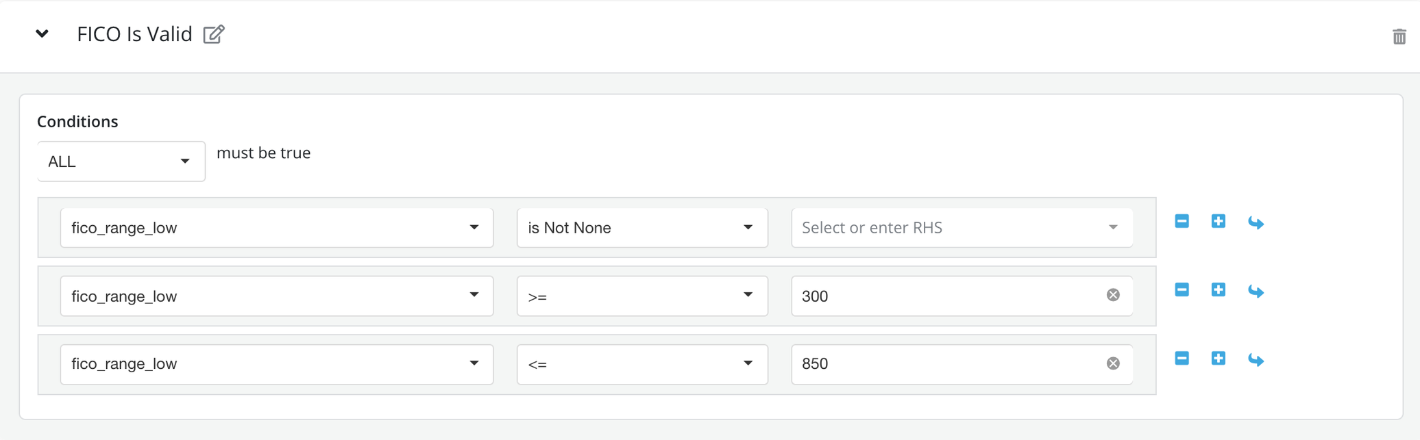 - Select Conditions as appropriate from the dropdown. ALL condition is equivalent to an AND condition. It means that all the conditions must be true for the rule output to be a PASS, while ANY is equivalent to an OR condition. It means if anyone of the conditions is true then the rule output will be a PASS