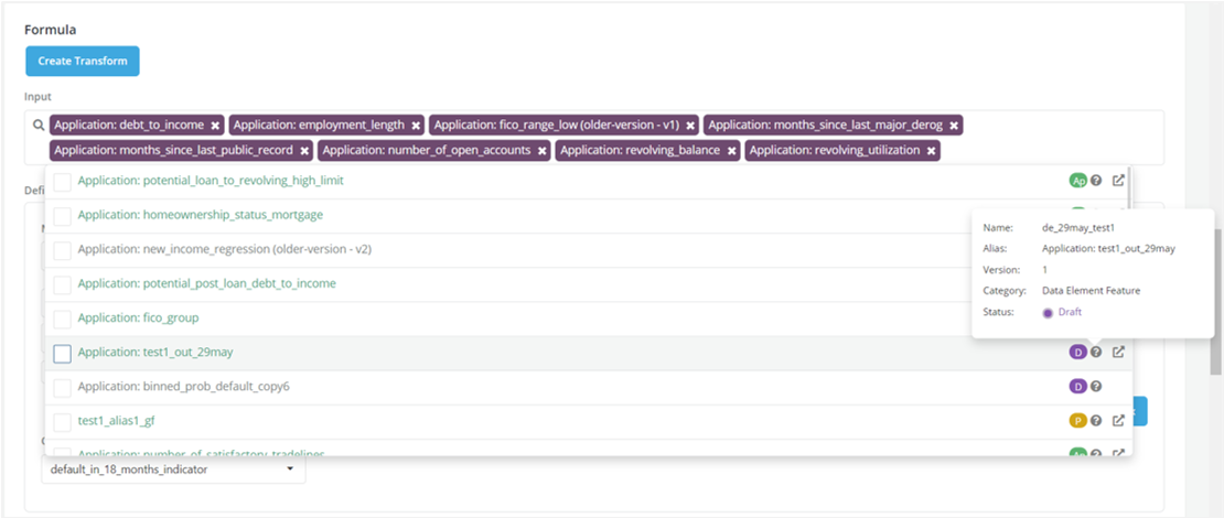 - The Objects in draft status are used in the Input section of the modules (Data Element, Feature, Policy & Model) while registering a model
