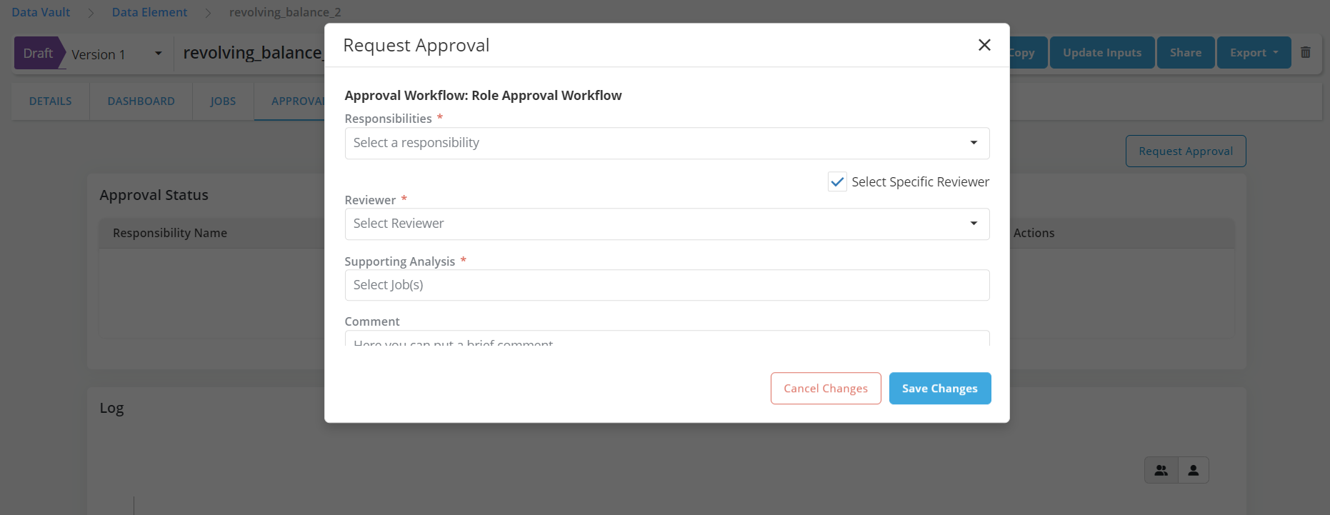Reject: Reviewers can use the reject option to reject a request. In the default setting of the platform, all approvers have to accept the request for it to be approved; hence a reject from one reviewer will result in the object being rejected regardless of the response from other reviewers.