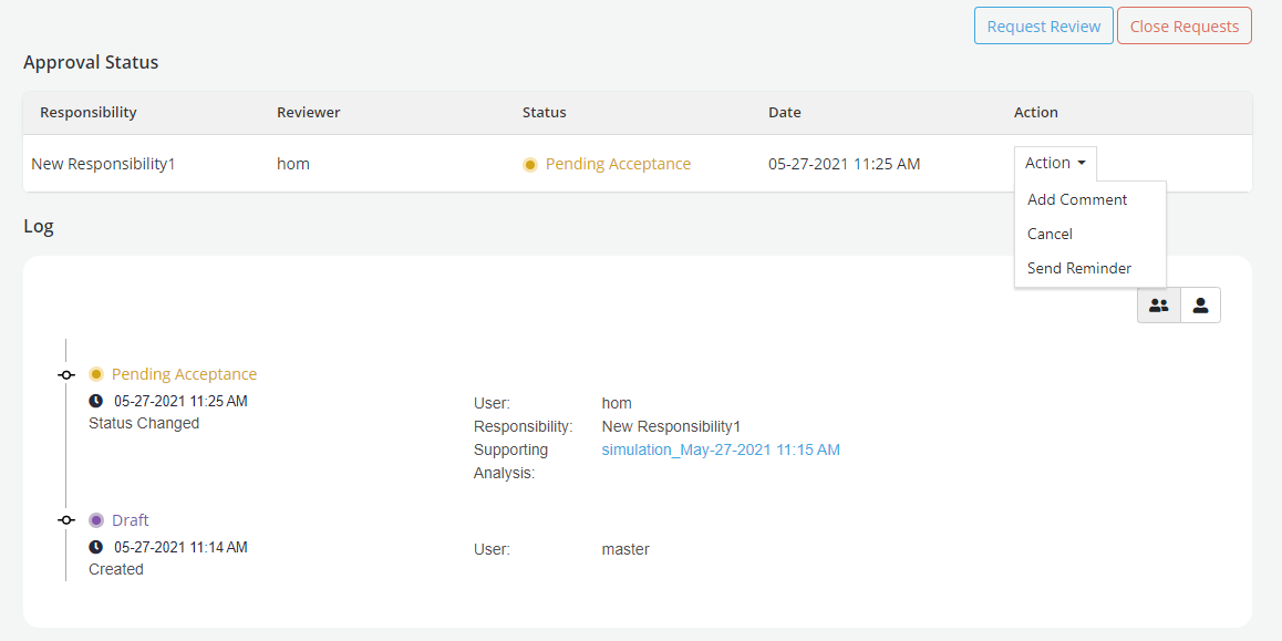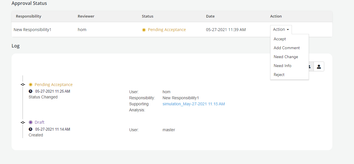 Accept: To accept the review of the object created. If there is one responsibility assigned for approval, the object changes to Approved after acceptance. If there are more than one responsibility assigned for approval, review status continues to be in Pending Acceptance till acceptance is received from each responsibility