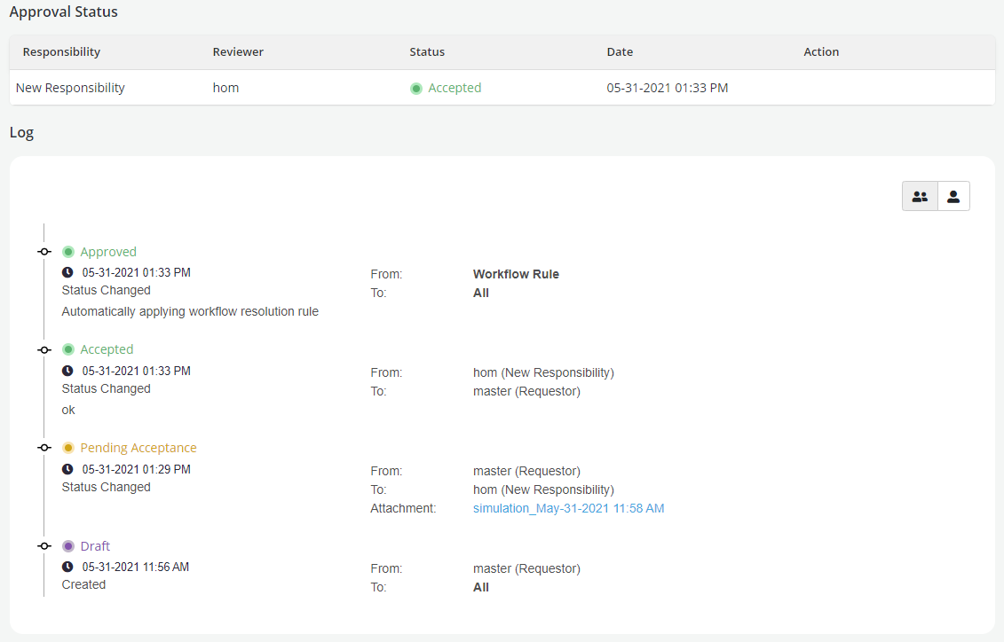 - User can view the entire approval log for all responsibilities by clicking on the Group icon or can see the log for his own bucket by clicking on the User icon