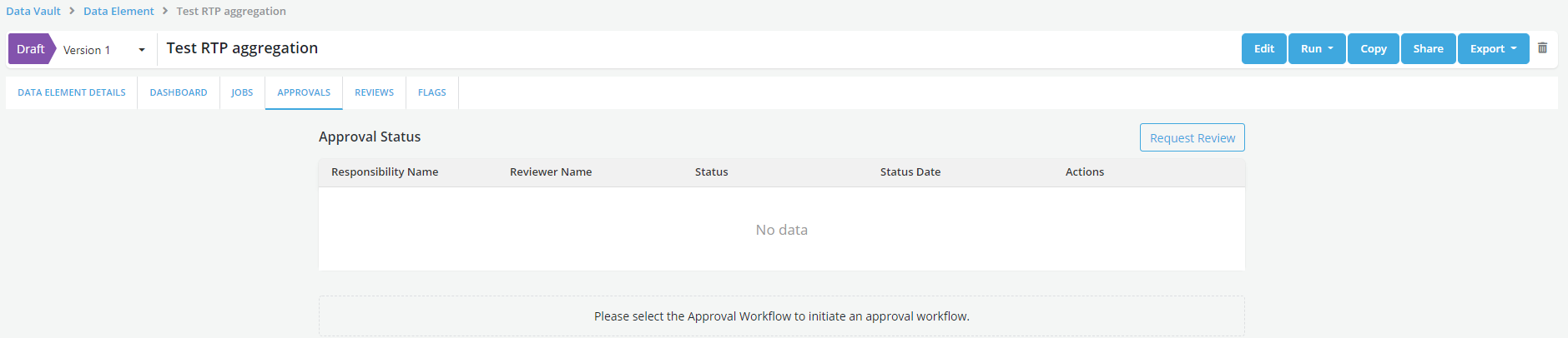 - To send the request for review and approval of the newly created object, click on the Request Review button in the Approvals tab
