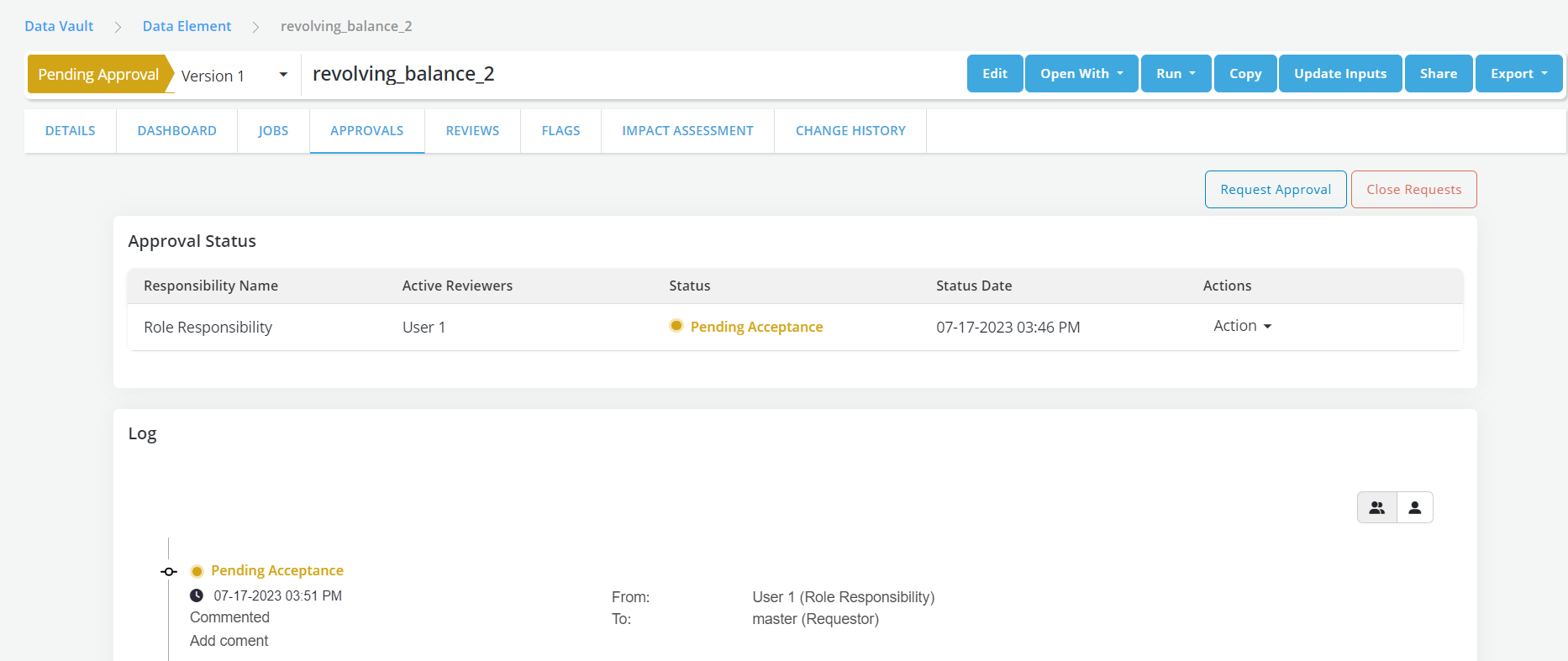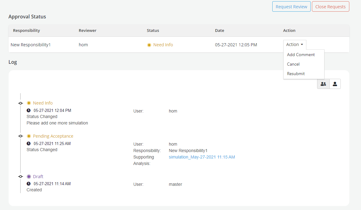When a Reviewer has asked for more info or any change the Review status changes to Need Info or Need Change. Requestor can attach a Job run while resubmitting the request for approval