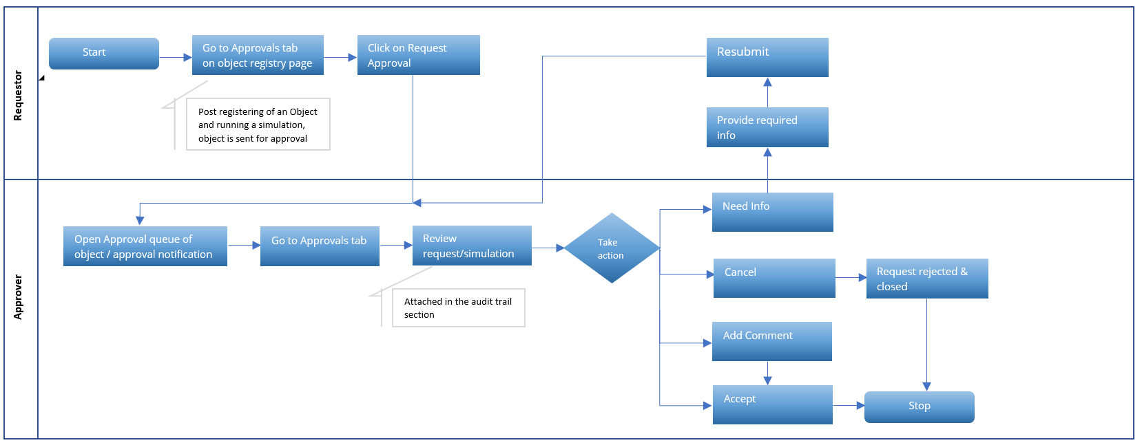 - If one of the approvers has requested for Need Info or Need Change then the object status continues to be in Pending Approval,though the Review status would change to Need Info or Need Change, respectively.