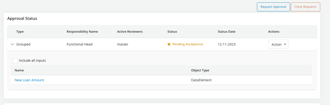 While requesting the approval of an object (a.k.a., main object) you can request of any of its inputs that are still in draft this process is called group approval request and works as follows: