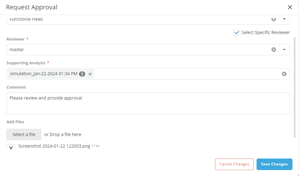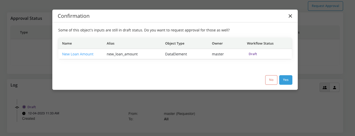 ** Case 1: If the object has inputs that are in draft status then you will be prompted to confirm that they also want to include the draft inputs in the approval request