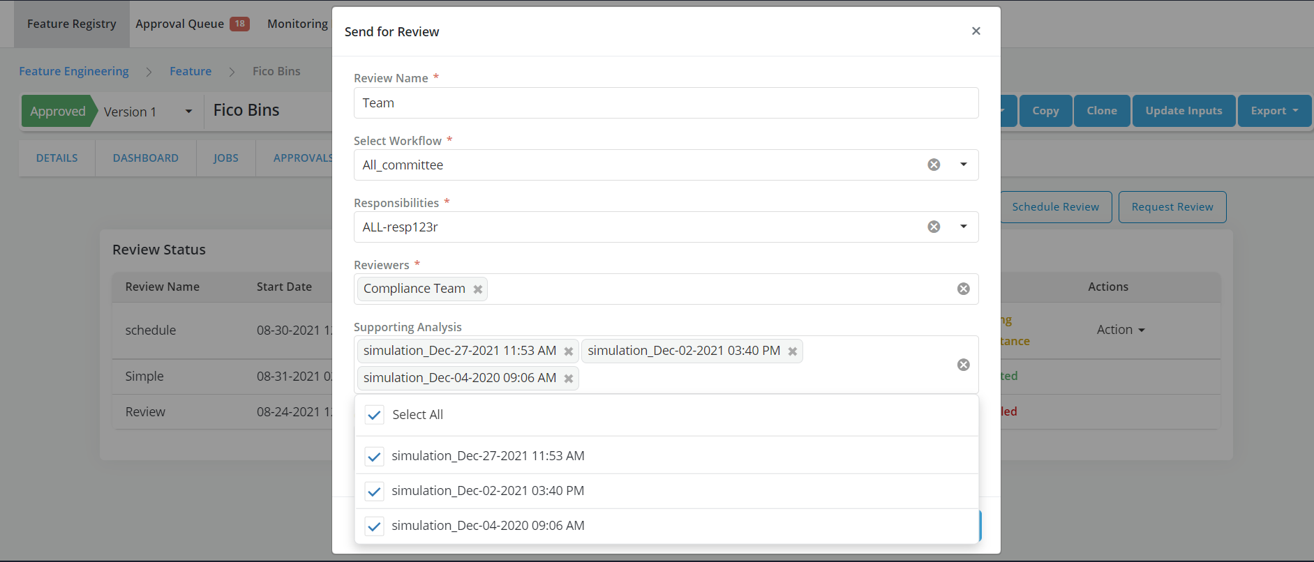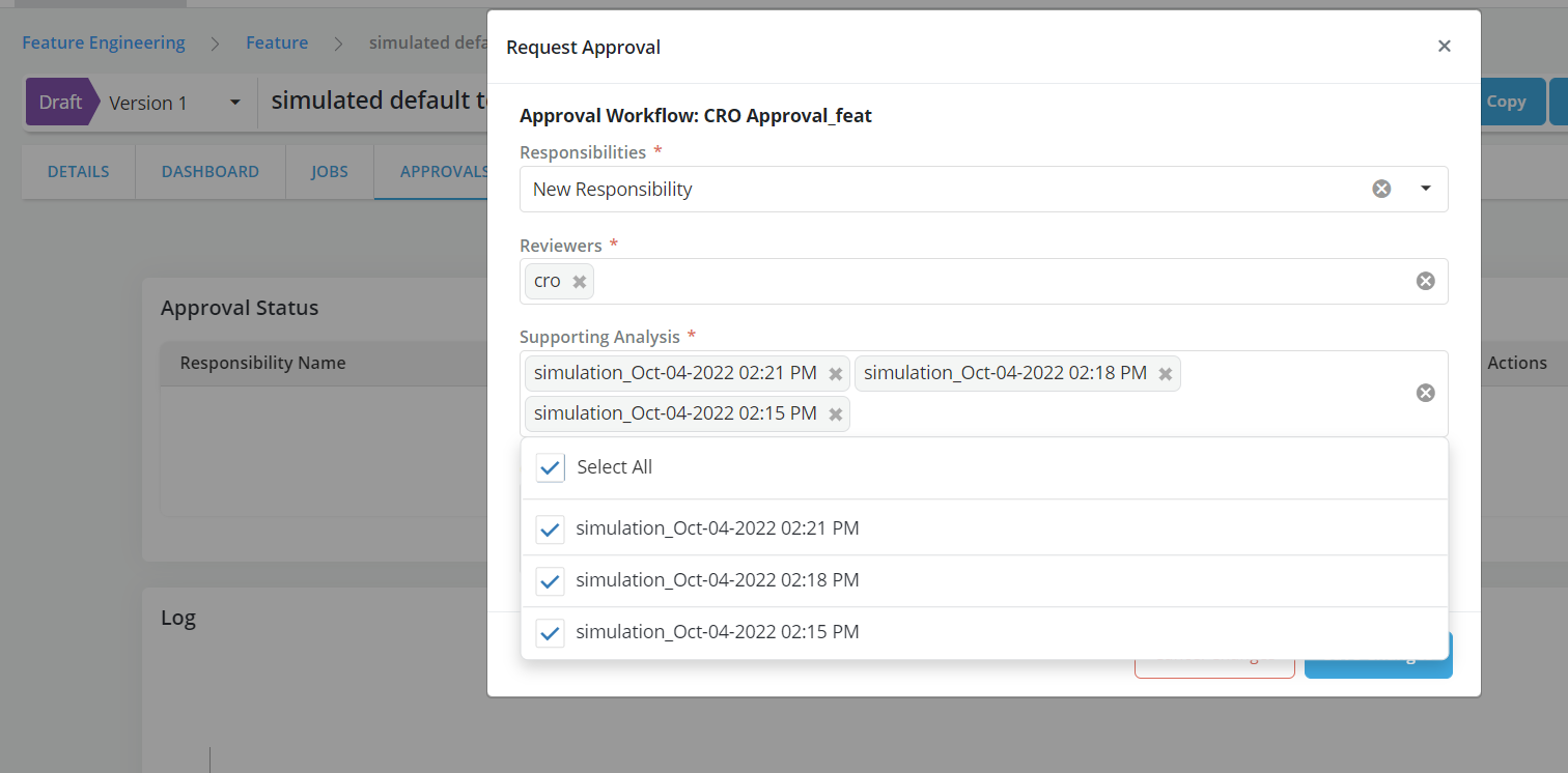 When the mode Publish Drafts is enabled, draft can be used by other objects prior to being approved. Otherwise, only approved or chared objects can be used as inputs to other objects. By default, a simulation must be appended to the request for approval. This requirement to attach a simulation can be changed in Settings by a user with the right approval authority"