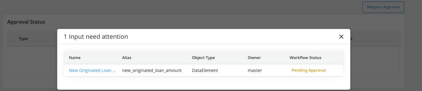 ** Case 2: If the object has inputs that are in pending approval status then you will be prompted to complete or cancel the approval request of the pending approval inputs before submitting the request