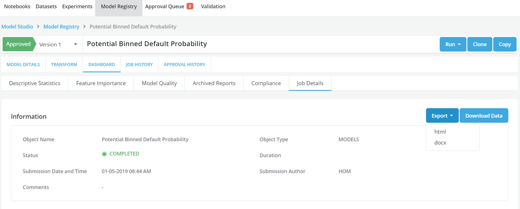 - Upon successful simulation of a Model, an Export button will appear in the Job Details tab.