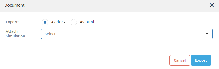 Documentation can be downloaded in docx. and html format. Choose the simulation from the dropdown to download the results of the simulation.