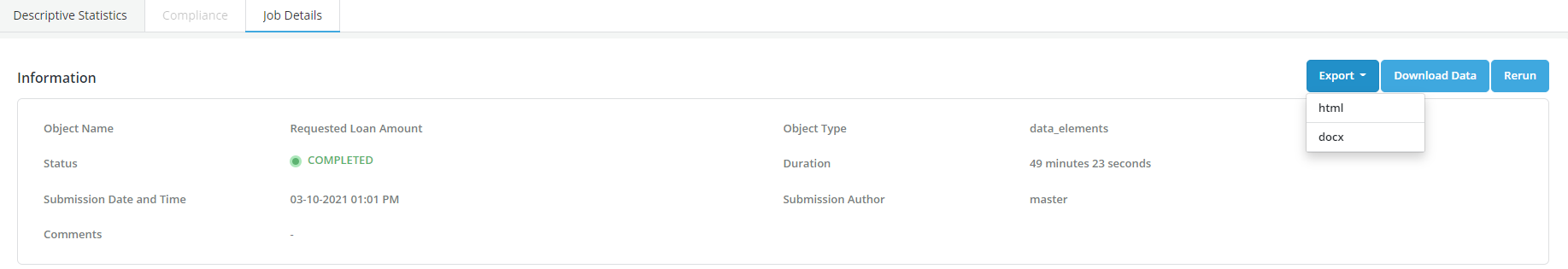 A document can be exported once the object is registered on the Platform. This document can be exported either in docx or Html format. The documentation contains the simulation’s reports and charts along with the metadata of the simulated item. At present this functionality is available for data elements, features, models and policies.