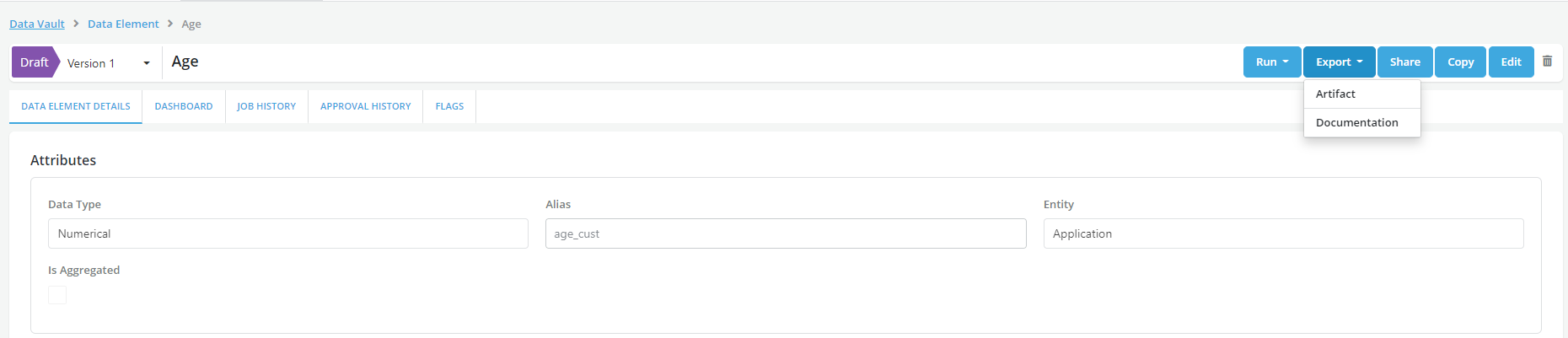 - Access Job Details tab within the Dashboard and click on Export and choose Documentation for exporting the Documentation