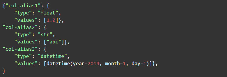 To run the artifact, call the main() function in the artifact with the needed data. The python_dict.py contains a main() function into which data can be sent - in the form of a python-dictionary for low-latency execution. A data table in the dictionary format is described as a dictionary with type/values. For example: