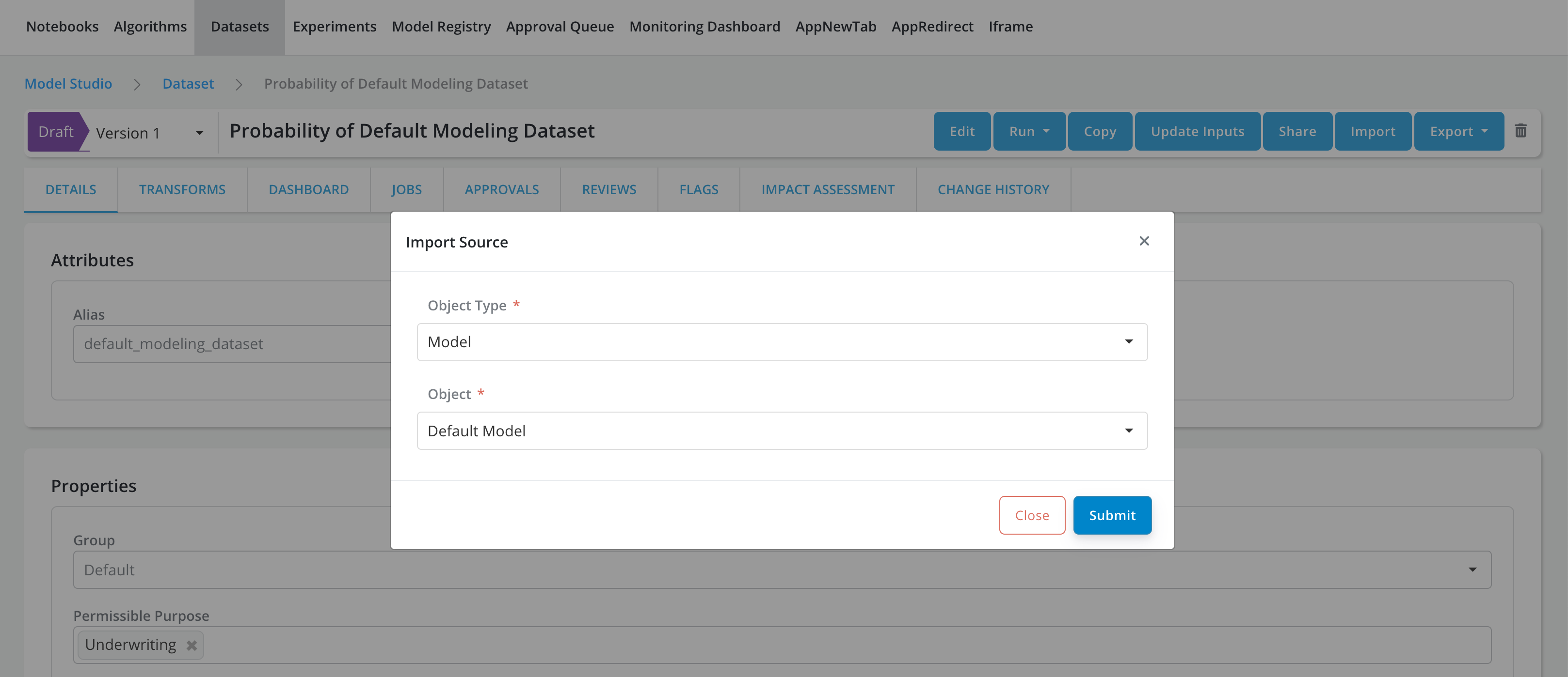The import capability allows us to update an existing object using objects of different types. For example, we can create a dataset that includes all the variables used in a registered model by importing the dataset from the registered model object. When importing, the dataset's independent variables and dependent variable will be updated based on the model's inputs and dependent.