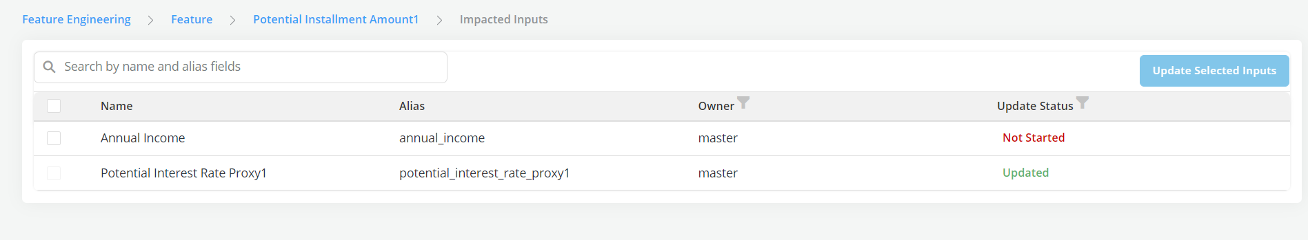 Updated Inputs Page: Shows list of inputs which need to be updated (i.e., have a new approved version)