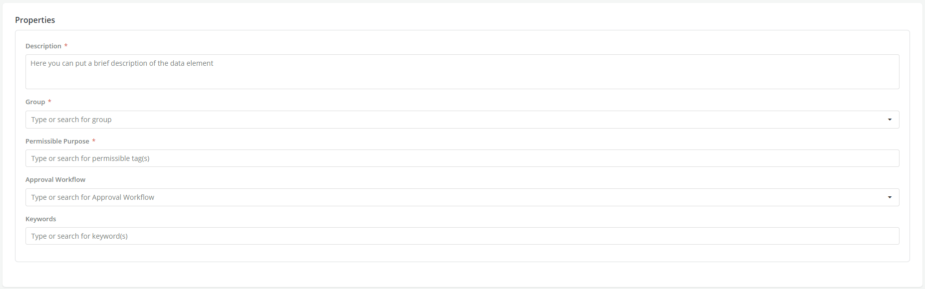 Enter details in Properties Section with Description (free-flow format), Group, Permissible Purpose), Approval Workflow and Keywords