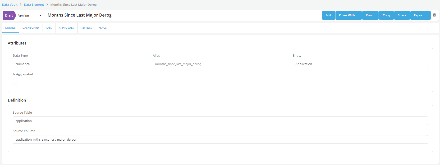 A data element is an information or set of information received from external parties or systems (i.e. application data, credit bureau data).