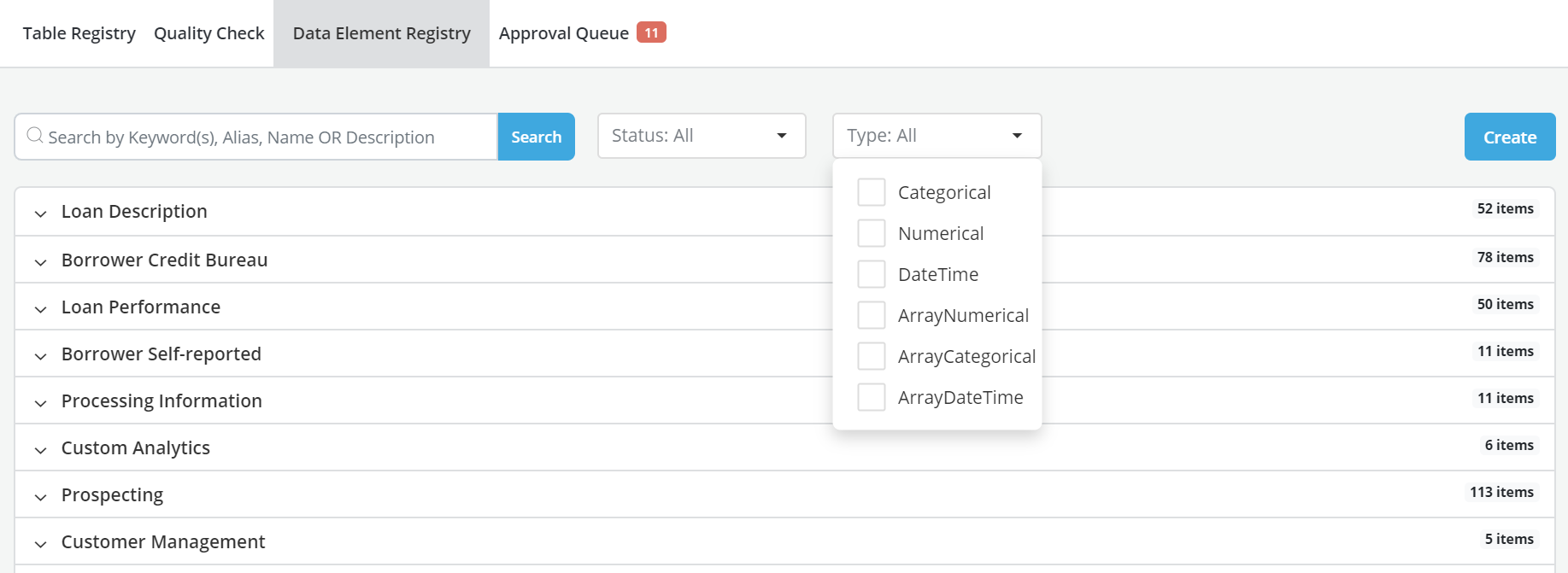 After completing all the above information, click on the Create button at the bottom of the page to save a draft of the Data Element that has just been created