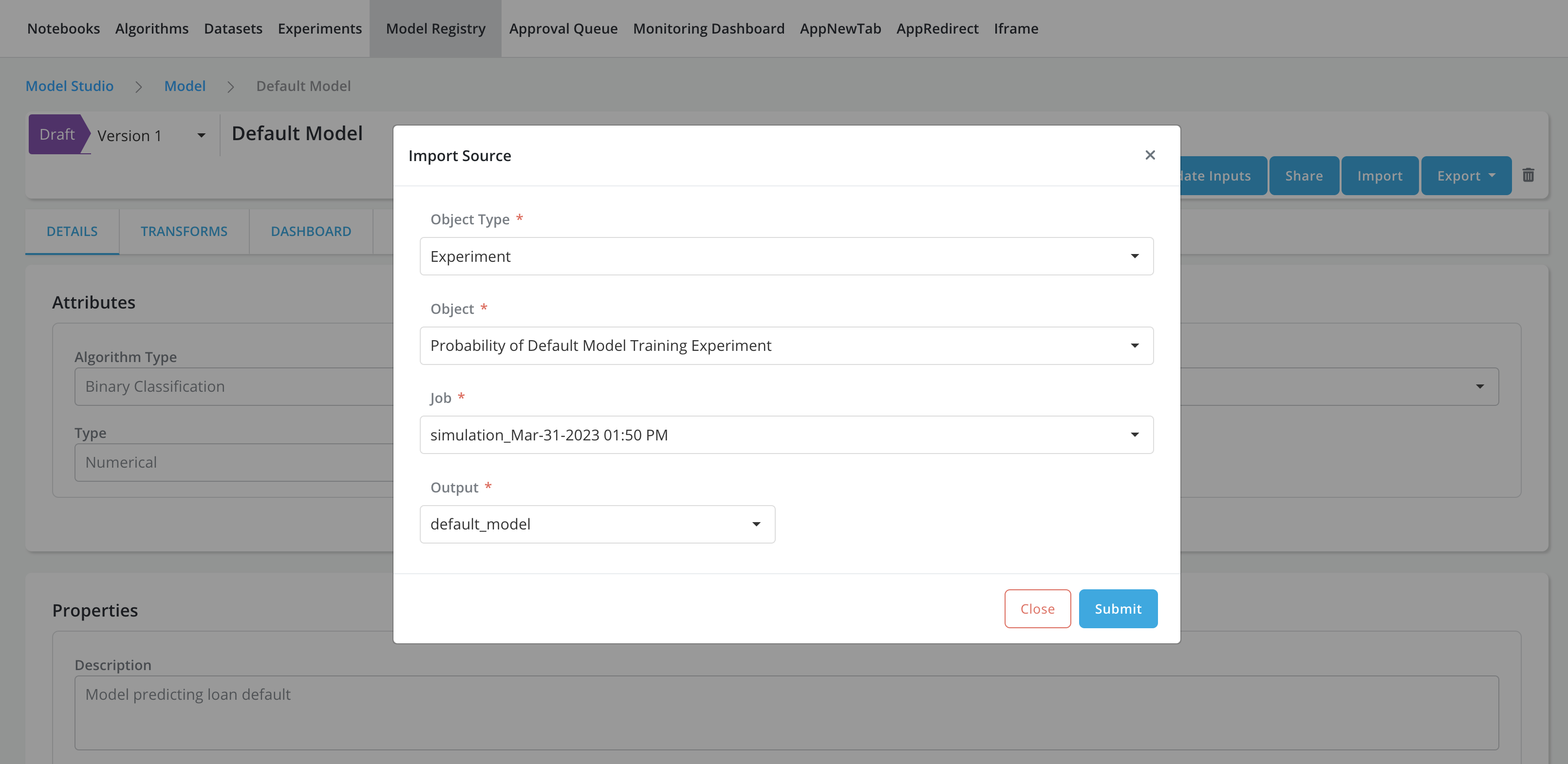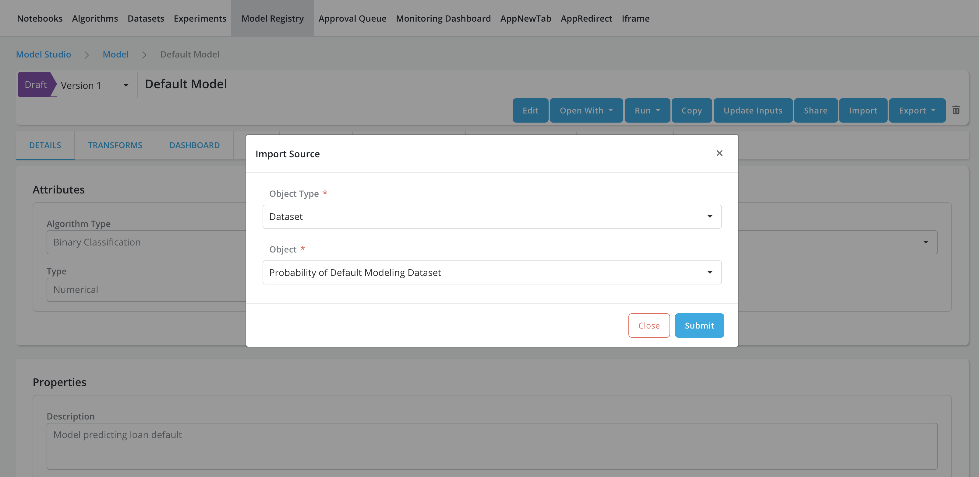 Object Type: Choose the type of source object. Currently model can be imported from dataset or experiment objects