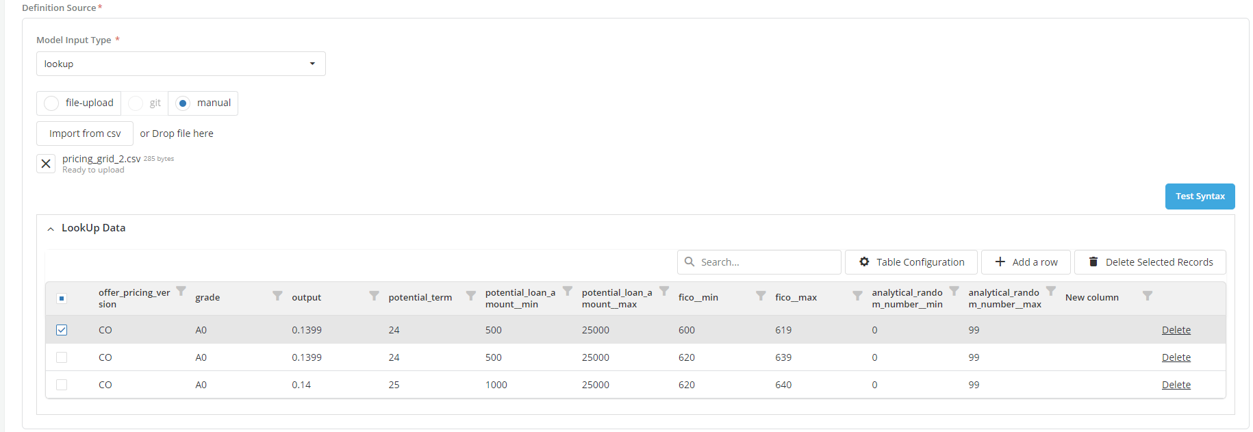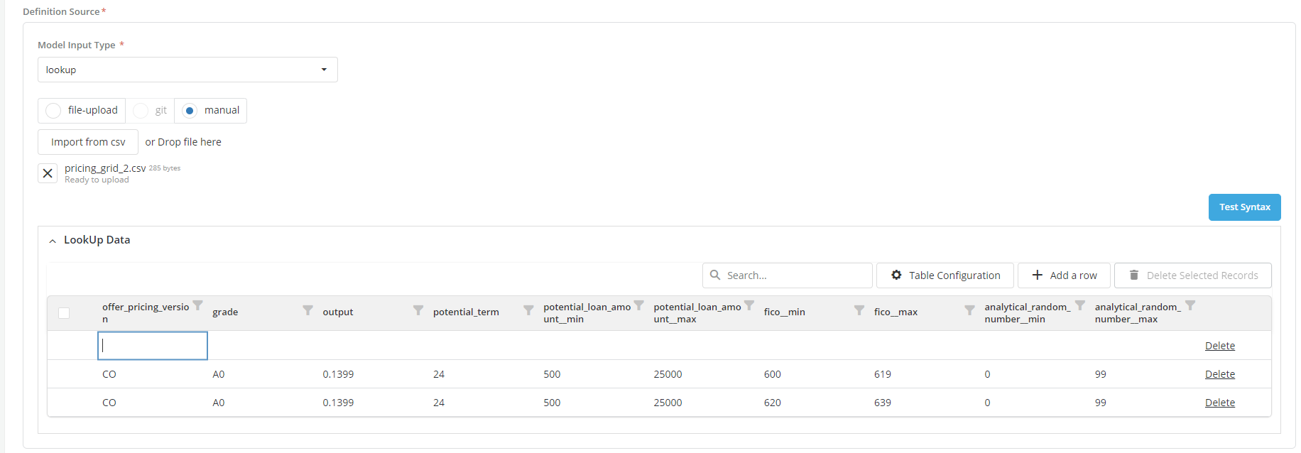 - Click on test syntax to verify that all inputs are declared and match with the uploaded file’s expected input