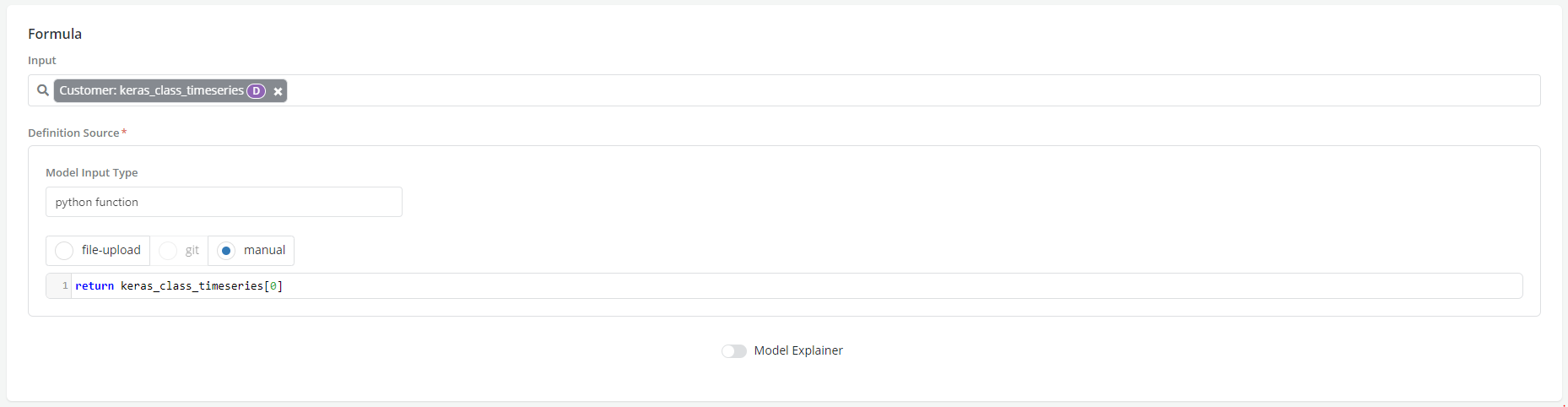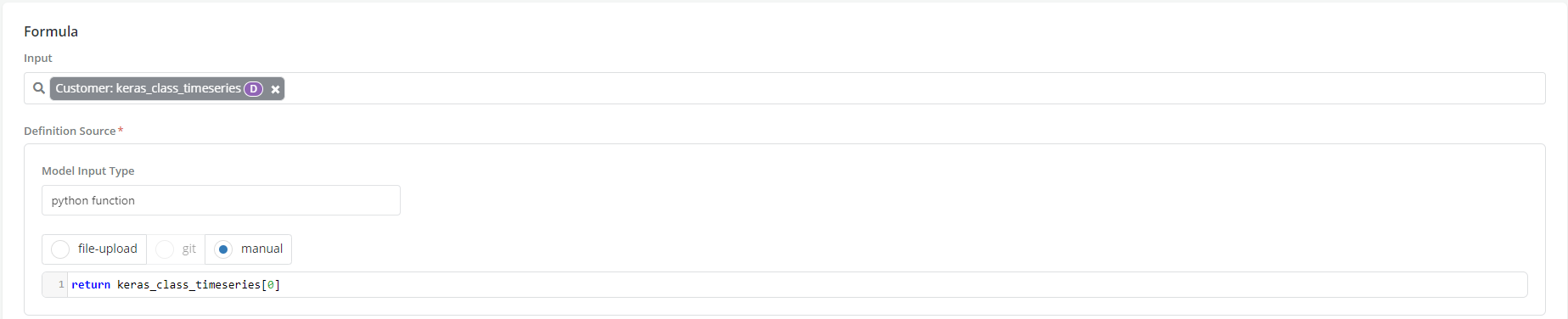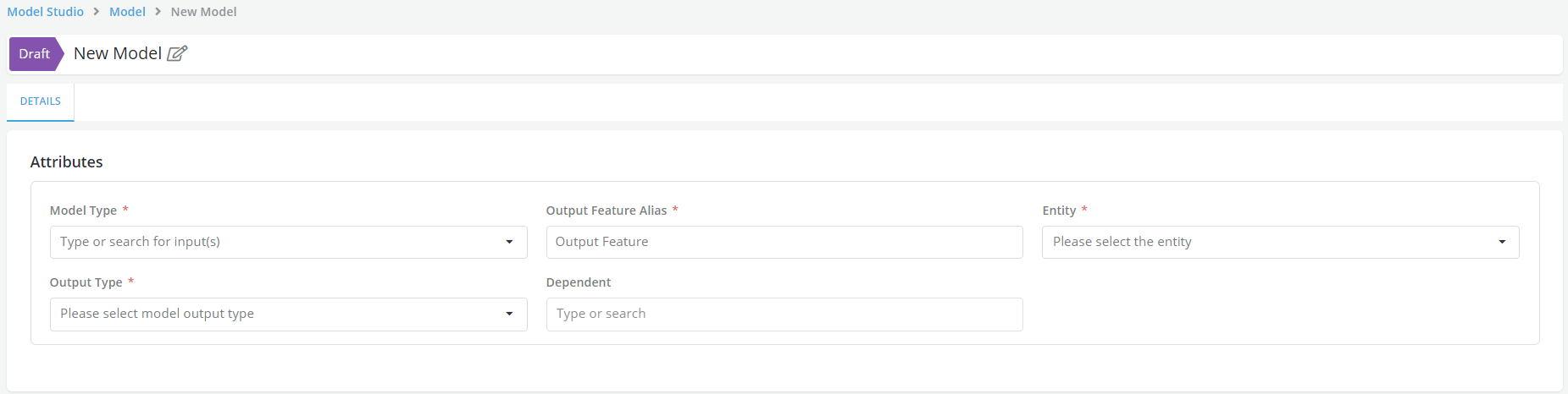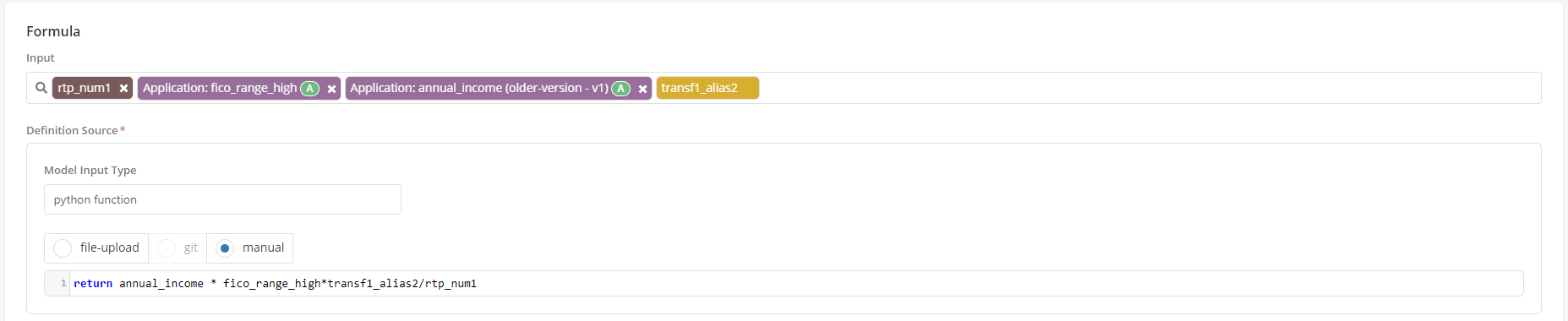 Input: These inputs can only be data elements and features that have been registered on the Platform. Only the latest active version of each feature or data element will be available for input to a model. A User can search and select as many fields as needed from the list of available features and data elements that appear when they click on the Input box (features are highlighted in green while data elements are in purple color)